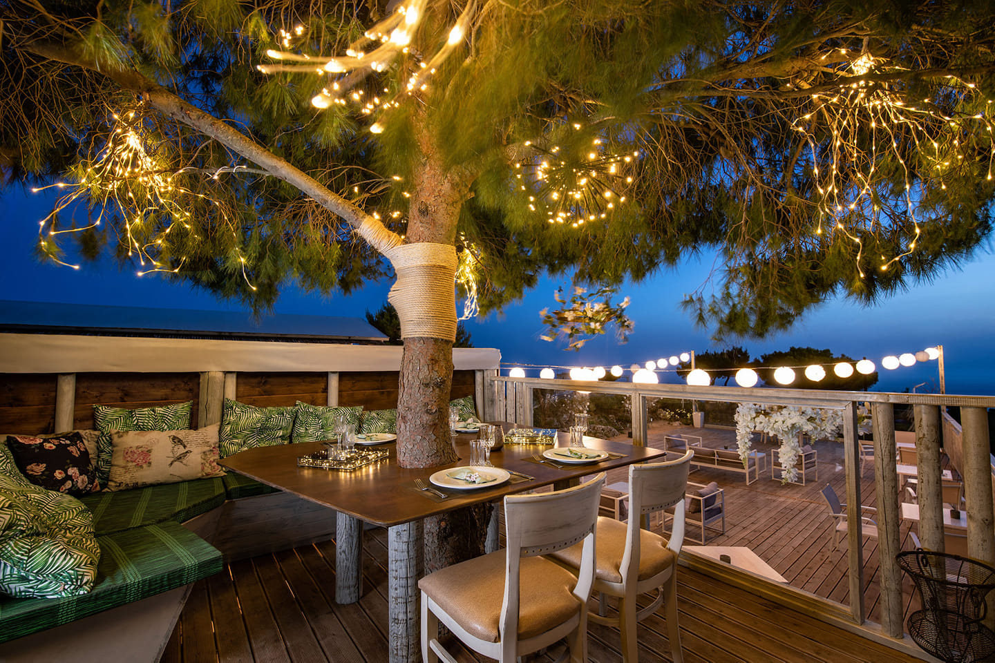 High above the cliffs of Agalas, Cave Damaianos enchants guests with twinkling lights and dreamy sunset colors painted across the horizon. Don’t miss the Crispy Rolls rustic pie stuffed with caramelized onions, pork loin fillet and veggies, and try the sea bass carpaccio for a refreshing starter. For a main, go for the Lamb Aberloulou, which is slow-cooked over vine leaves that leave a gentle smoky aroma.