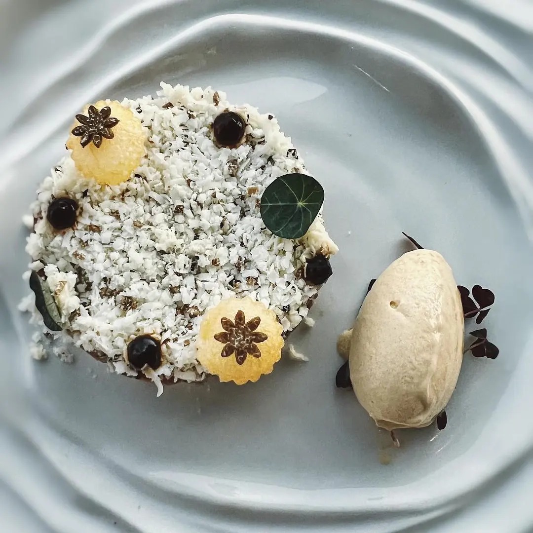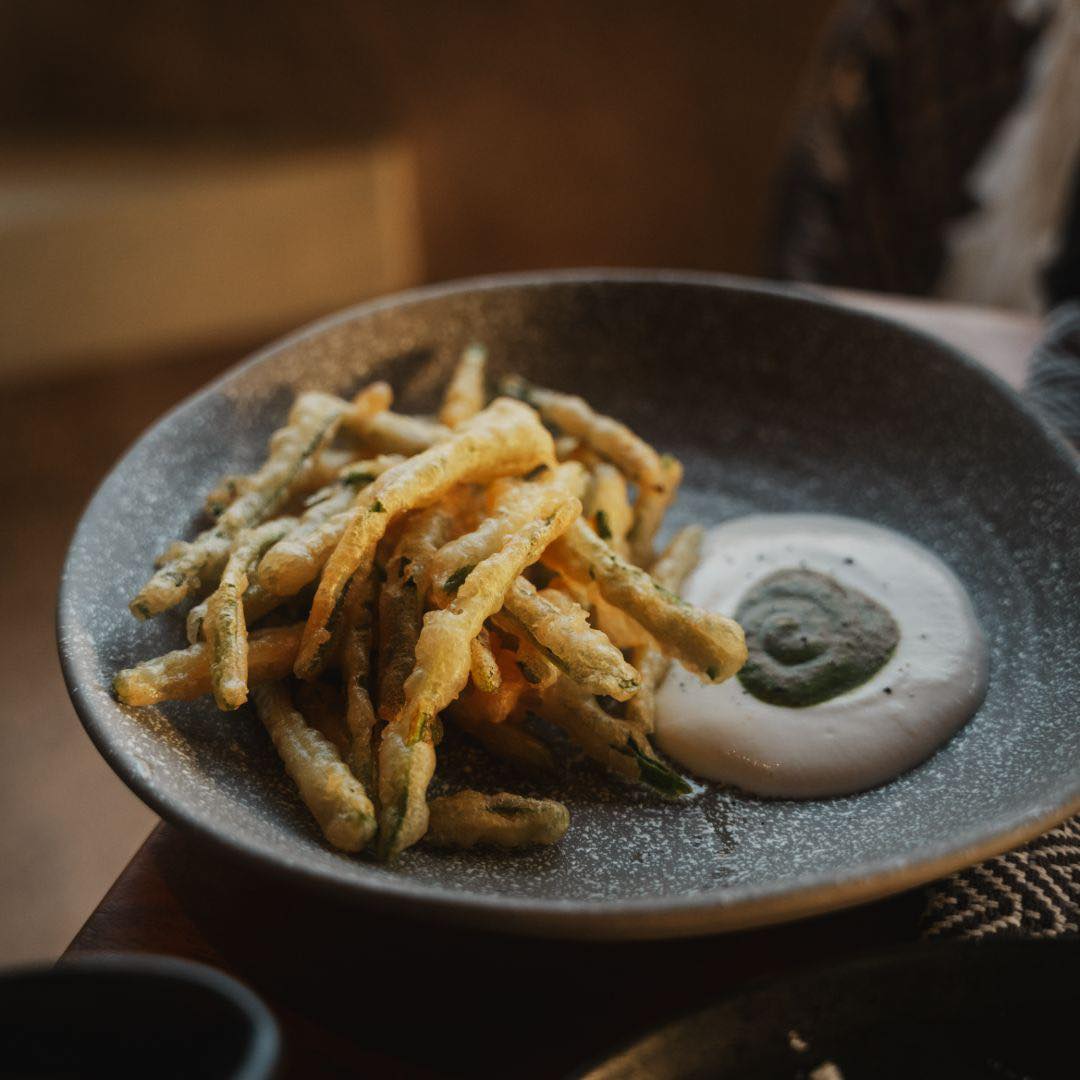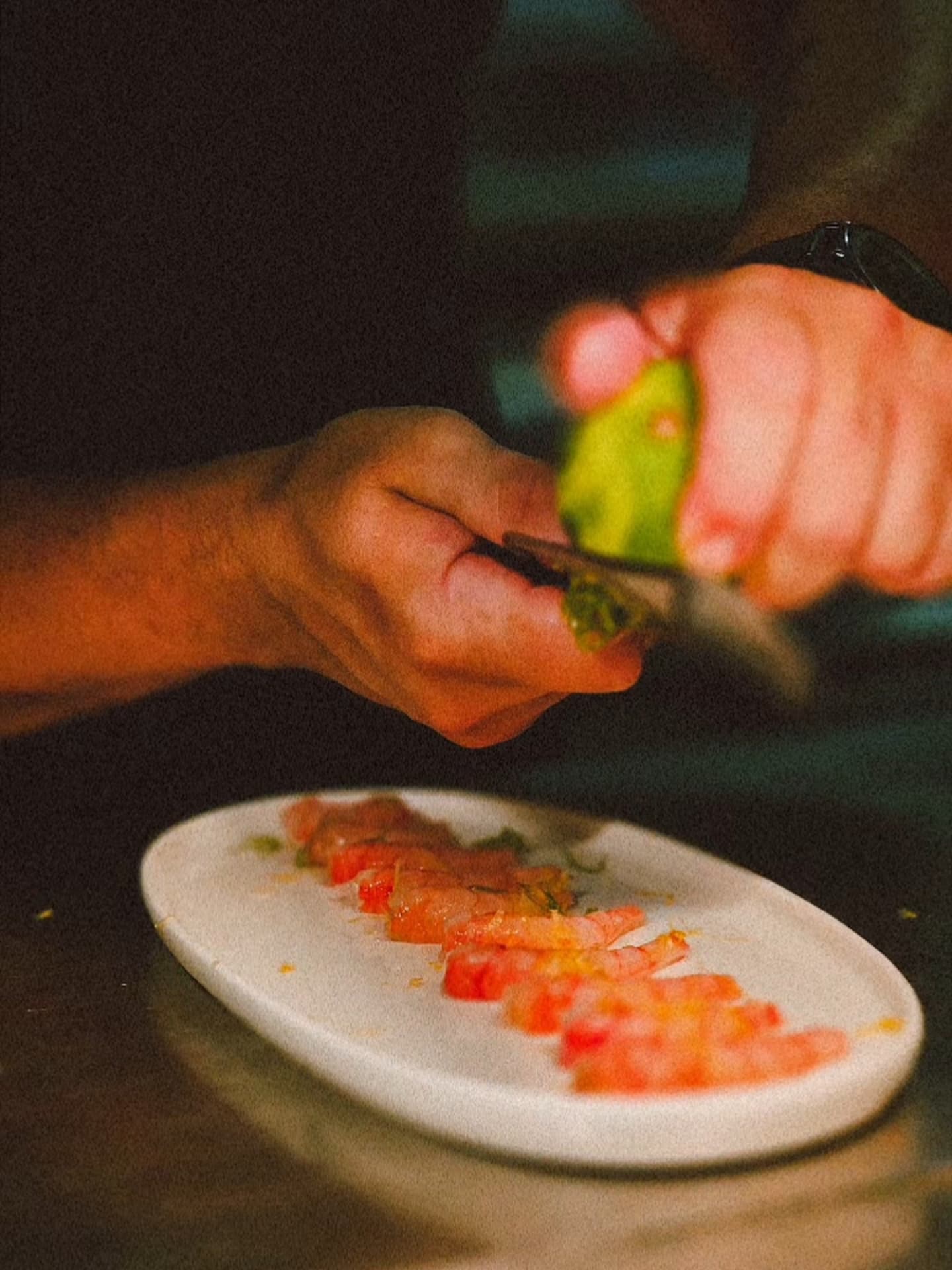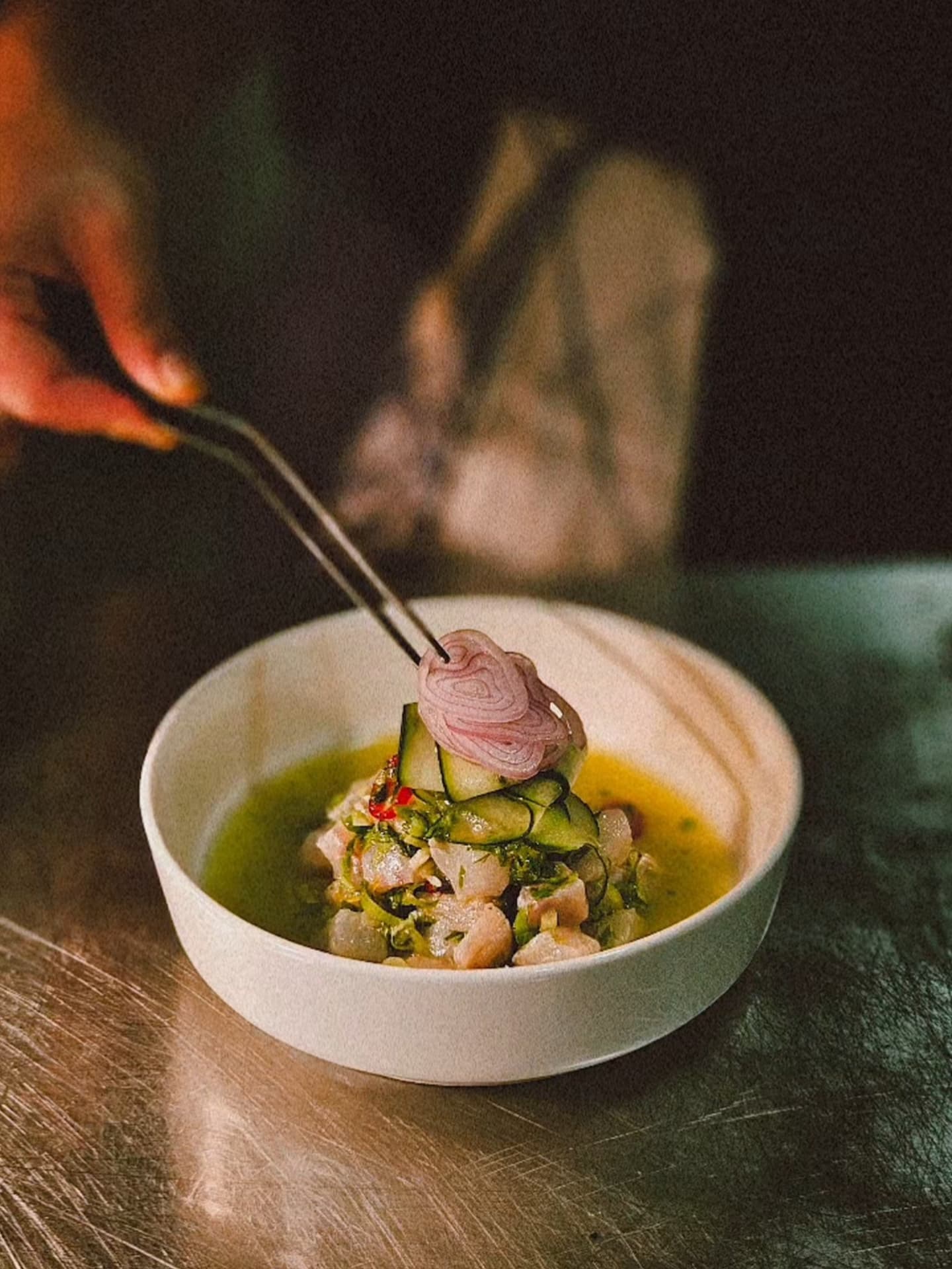 A short menu shapes how dinner works here, keeping the focus on a limited number of dishes. The cuisine follows a modern Mediterranean direction, with Ionian references appearing most clearly in seafood and pasta. A defining plate is seafood carbonara made with mussels, calamari, breadcrumbs, and caviar, alongside beef sofrito prepared with aged vinegar.