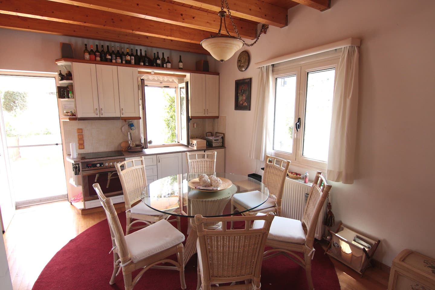 The villa has a large parking area for many cars, as it can accommodate small groups of 4 or 6 people, up to larger groups of 12 adults. Just 15 km from the famous, crystal blue Pelion beaches and 19 km from the city of Volos, this accommodation combines the air of the mountain and the sea in a traditional atmosphere of discreet luxury and comfort.