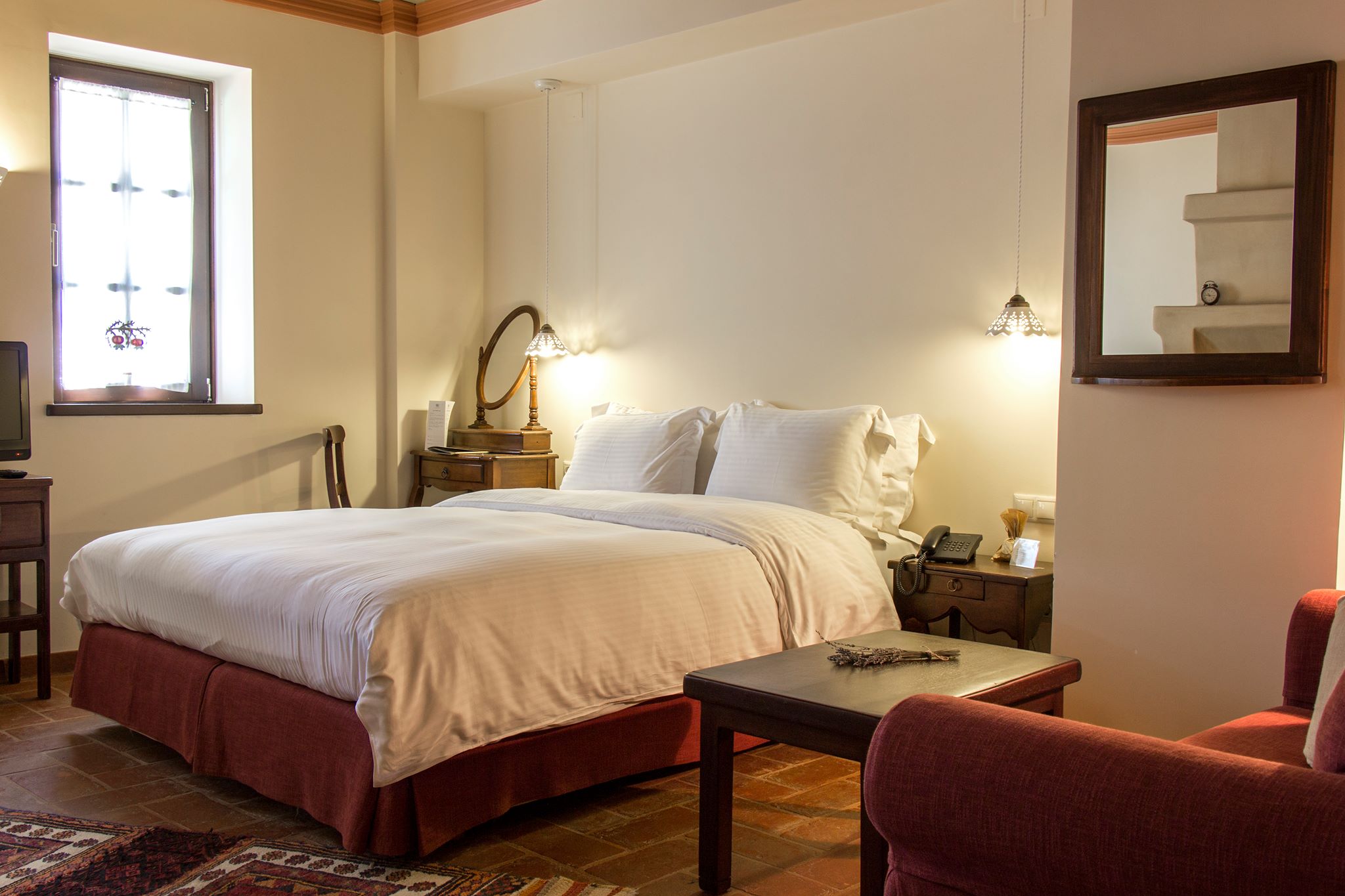 It has 12 rooms, 3 of which are suites. It’s distinguished by its exceptional décor, the soft colours and the mixing of traditional elements with more modern décor choices. The hotel is also known for its restaurant that serves classic Greek cuisine and local traditional dishes, all prepared with local ingredients.