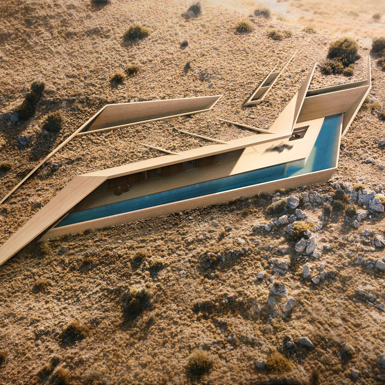 Dividing one building in three separate yposkafa parts aimed at fully incorporating it into its surroundings. The result is an impressive villa that promotes the Cycladic landscape through a modern minimalist aesthetic, achieving its incorporation into the natural landscape.