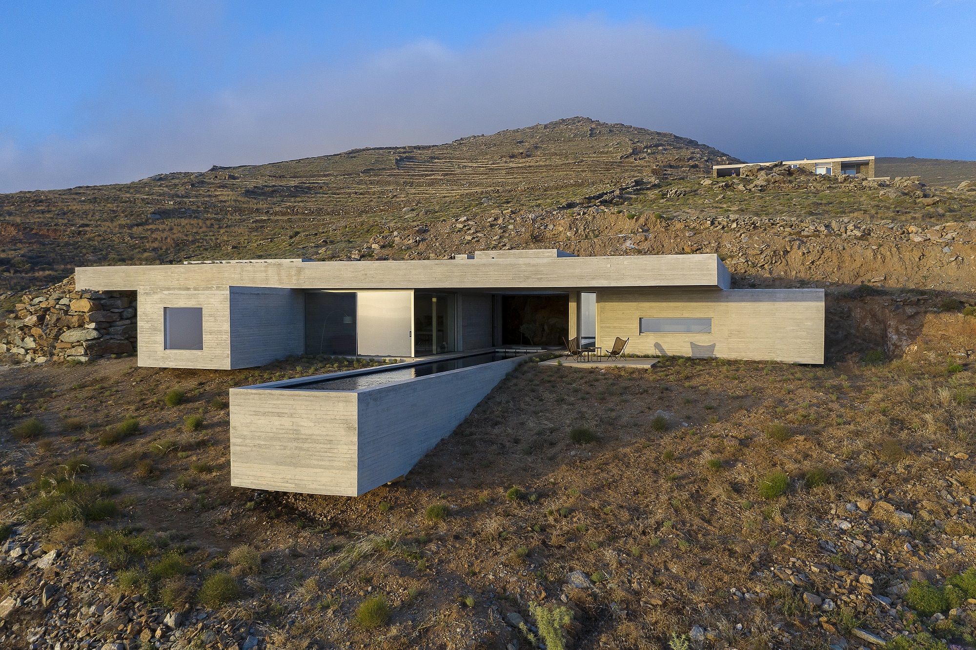 The colour palette used is inspired by the colours of the rock, while the materials and the texture of the bare concrete further reinforce the blending of the building with its surroundings. The project’s aim is to achieve camouflage while at the same time preserving a dynamic presence. Embracing the idea of blending in with nature, the Lap Pool House invites its residents to live in connection with Tinos’ landscape and nature in general.