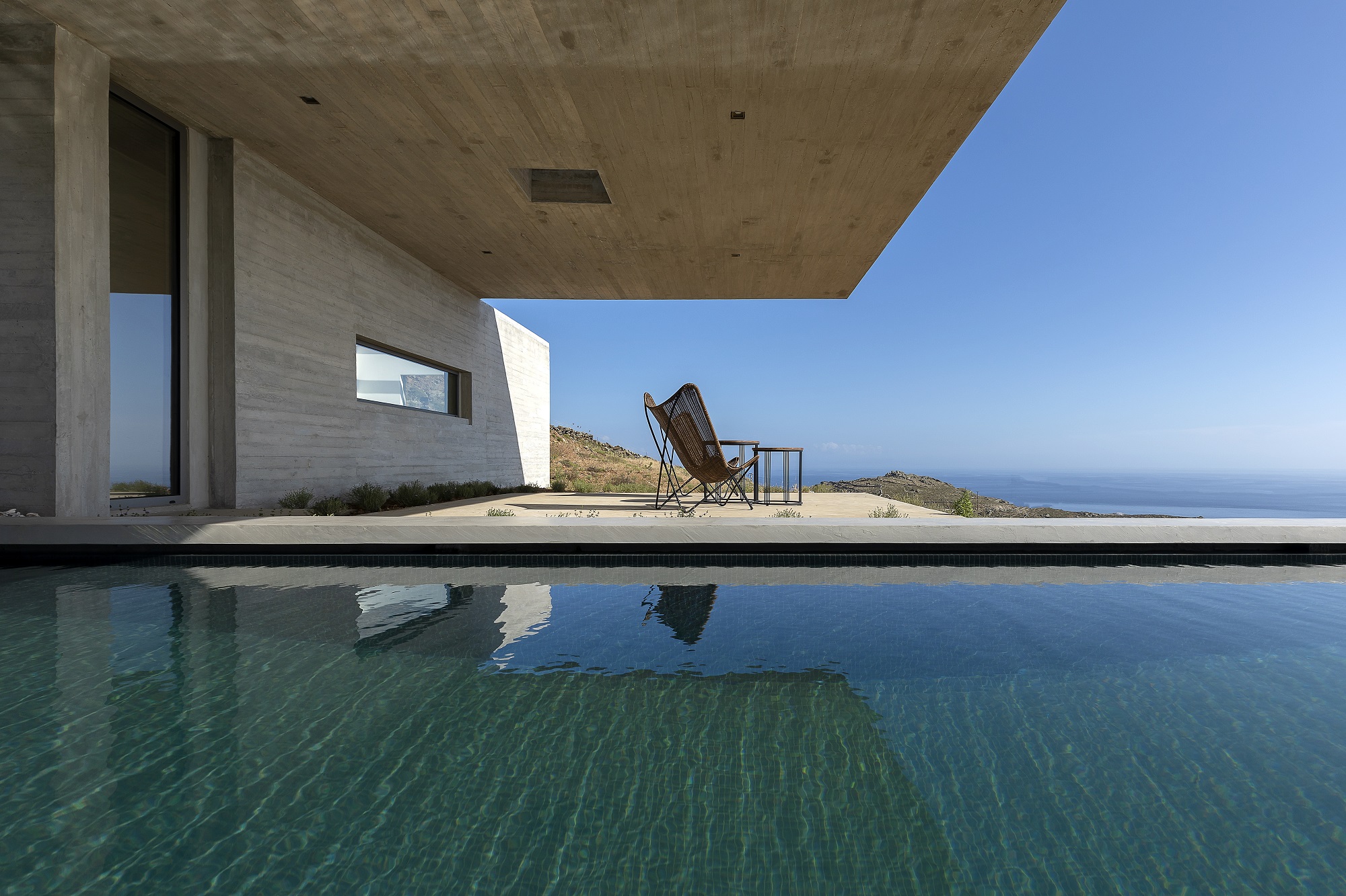 Inspired by the natural depressions and the ledges of Tinos’ rocks, Lap Pool House emerges in the environment like a manmade cave, offering exposure and privacy depending on where the visitor stands. The entrance is through a rupture on the back of the building, while the smaller cracks on the roof allow the light and the air to enter. The pool’s water contrasts with the rocky feel of the bare concrete, “translating” the interaction between the natural elements.