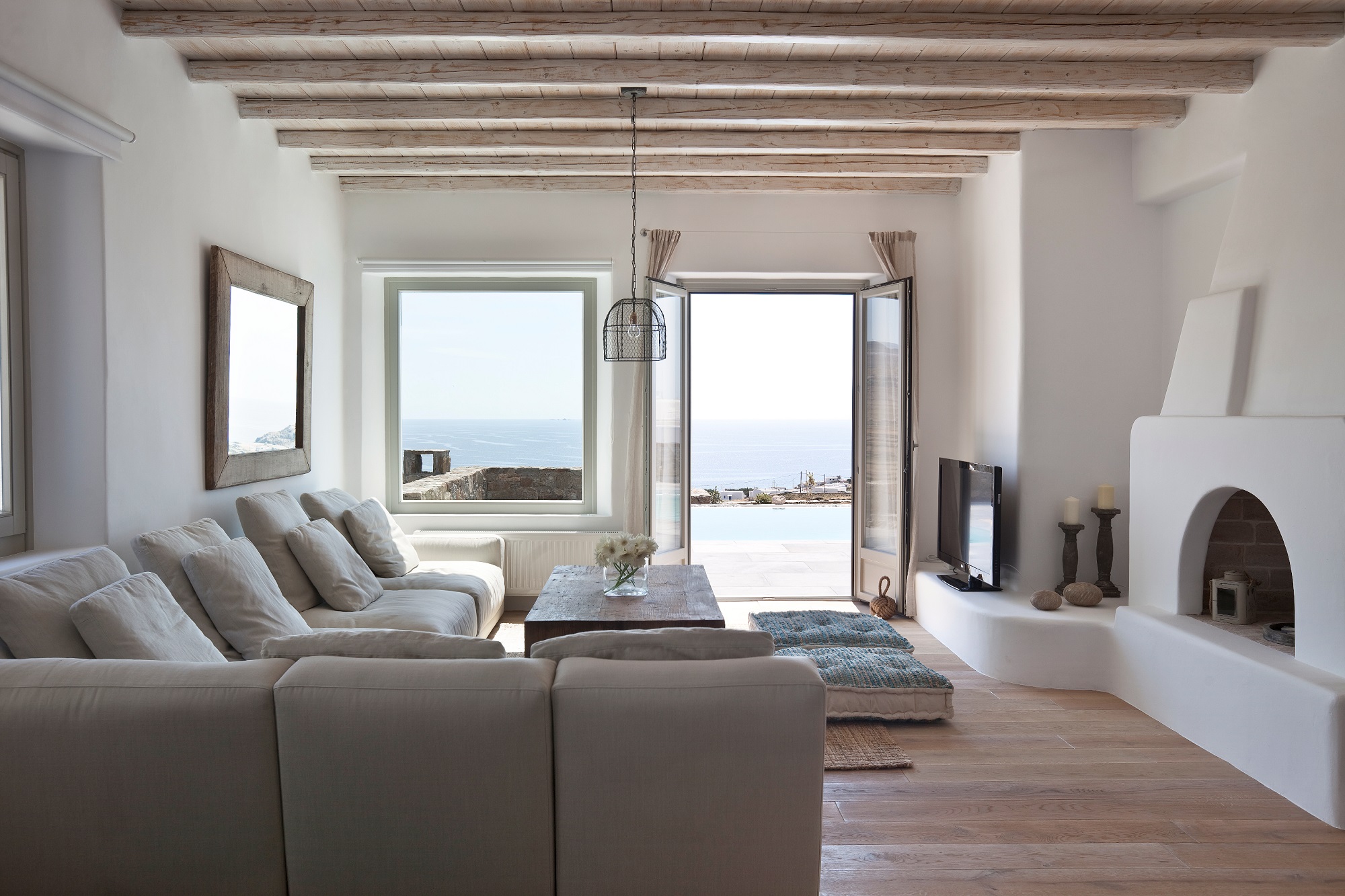 The main approach of the design was to combine the traditional Mykonian architecture with the modern facilities that are a requirement for rental summer villas. The result is an elegant game between the Cycladic style and modern lines that comes with meticulously planned lighting and a great choice of materials. For example, the solid oak 25 cm wide boards, the comfortable wood-and -linen furniture, the whitewashed wooden ceiling, the concrete floors – made according to local art – and the warm light all exude luxury combined with a local, rustic feel.