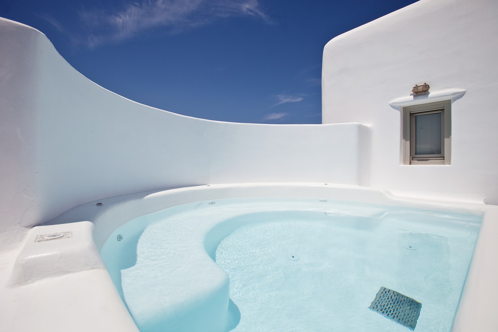 On the top floor, there’s a jacuzzi designed as a white sculpture with a unique view of the blue of the Aegean Sea that becomes one with the sky. The outdoor spaces are designed in the same concept, trying to blend in with the landscape’s natural beauty, with stone walls made with the local technique and chestnut wood pergolas covered in bamboo, and an infinity pool, while the tiles around the pool are grey granite.