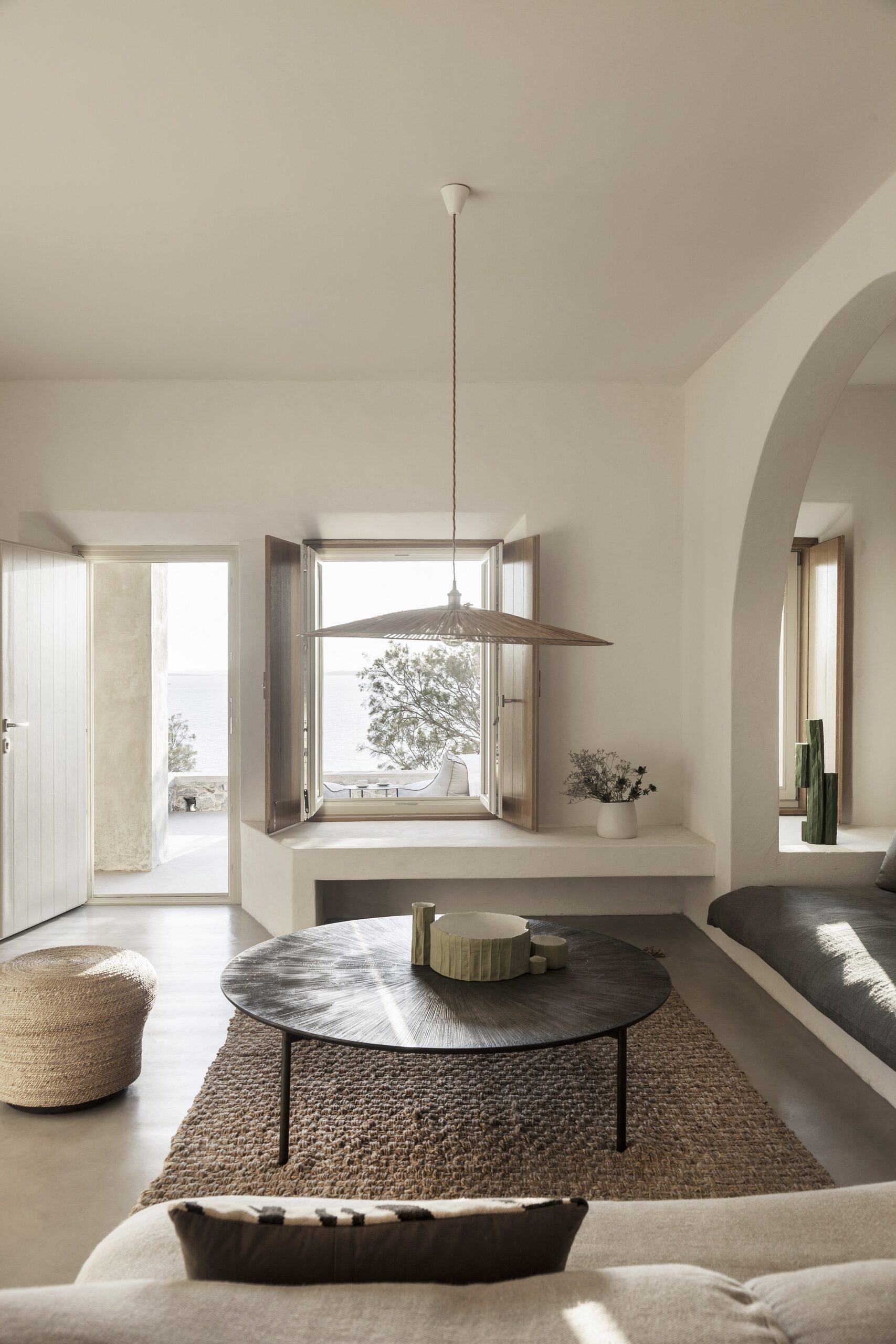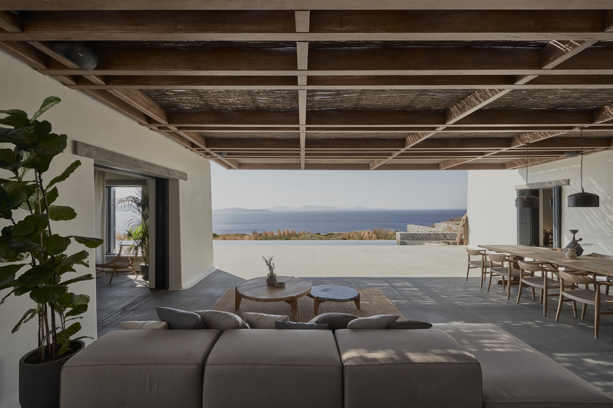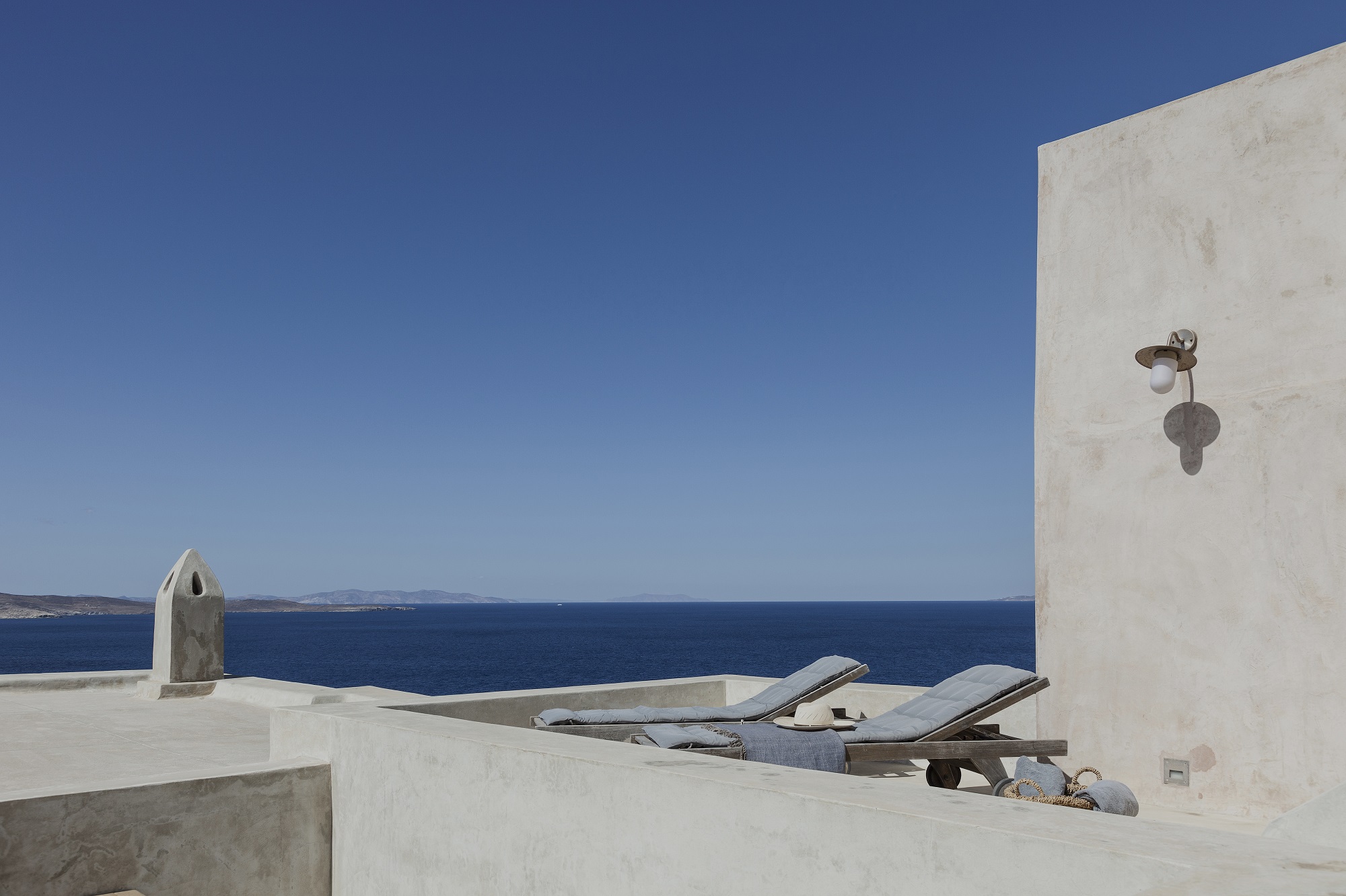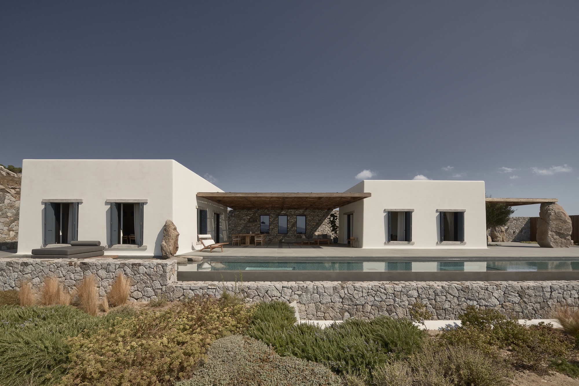 The simple white structures, the lines of the stone walls and the different, light levels of the pergola are easily incorporated into the Cycladic landscape, setting the pace of daily life. Villa Mandra is rooted in tradition, enriched by materials, and inspired by daily life.