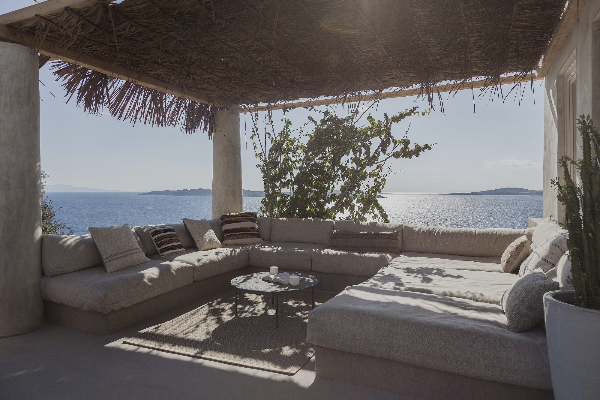 All of the outdoor furniture have been designed to be resilient to the harsh weather of Mykonos. The rustic covering in the garden provides shelter from the sun, creating at the same time a nice game between the light and the shadow on the floor.