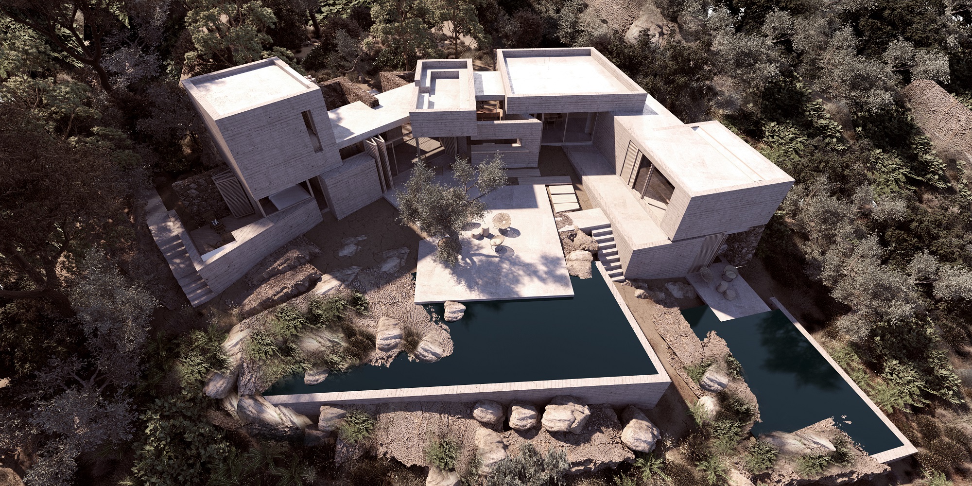 The existing cottage is a typical example of traditional Mykonian architecture. Cubic units form the main residence, defining an essential outdoor space. The architectural proposal focused on these two basic elements: the inner-view and the cubic volumes. The cube is transformed and deconstructed while following the existing footprint of the building. A solid stone wall surrounds the cubes, creating a strong back/border. With this border, the individual spaces of the house are oriented towards the inner centre, as it is the most significant area of the house.