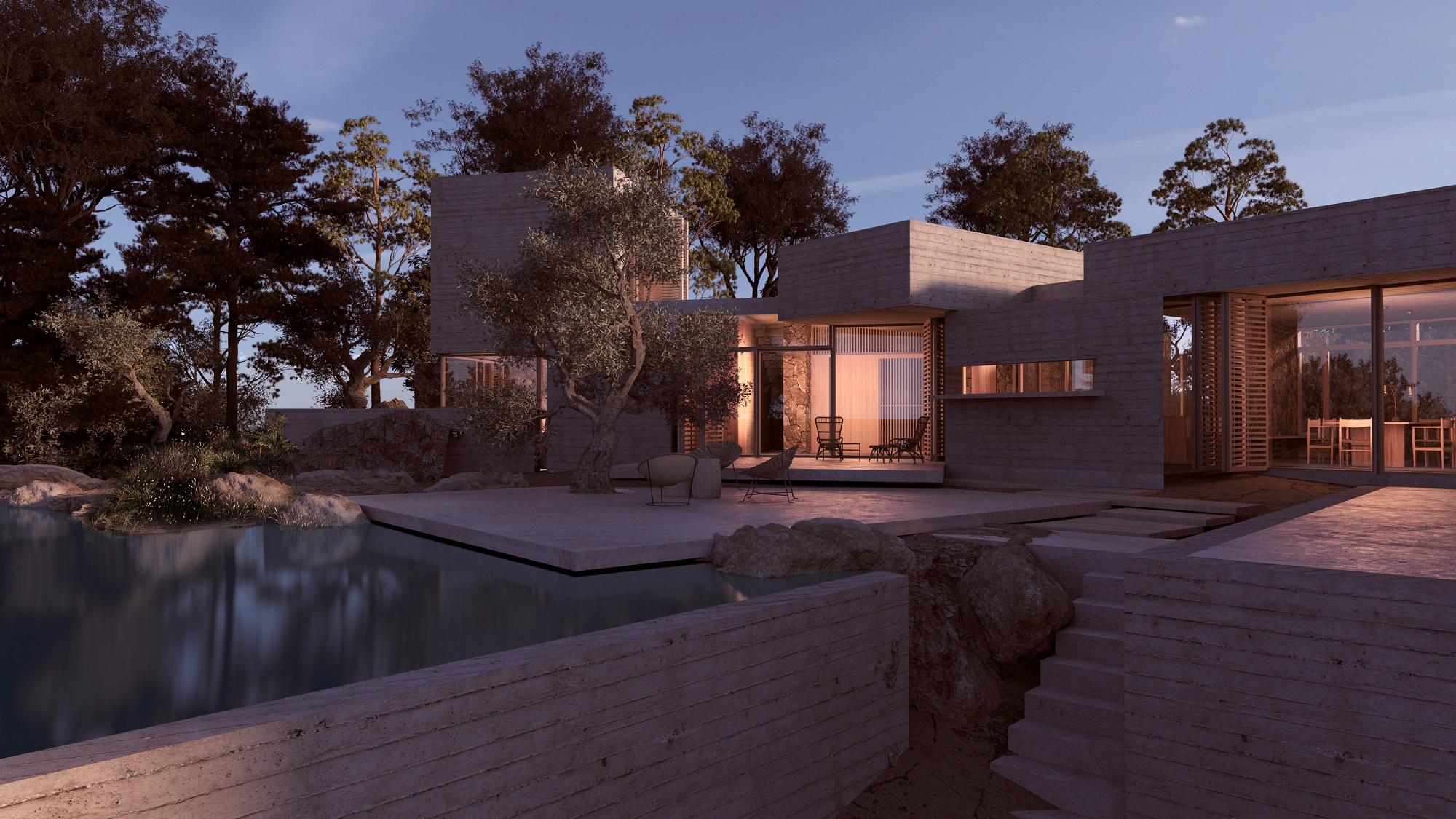 Η Villa Aqua Marine is built on three levels. On the entrance level there’s an open-plan space with a spacious living room with three impressive windows half emerged in the pool, a dining area and a fully equipped kitchen – with direct access to the outdoor dining space and the service quarters. There’s a sculpted concrete staircase that leads to the master bedroom and a double bedroom on the upper level, both with ensuite bathrooms, and to a suite on the lower level with the light coming through an impressive window that goes out on the pool.