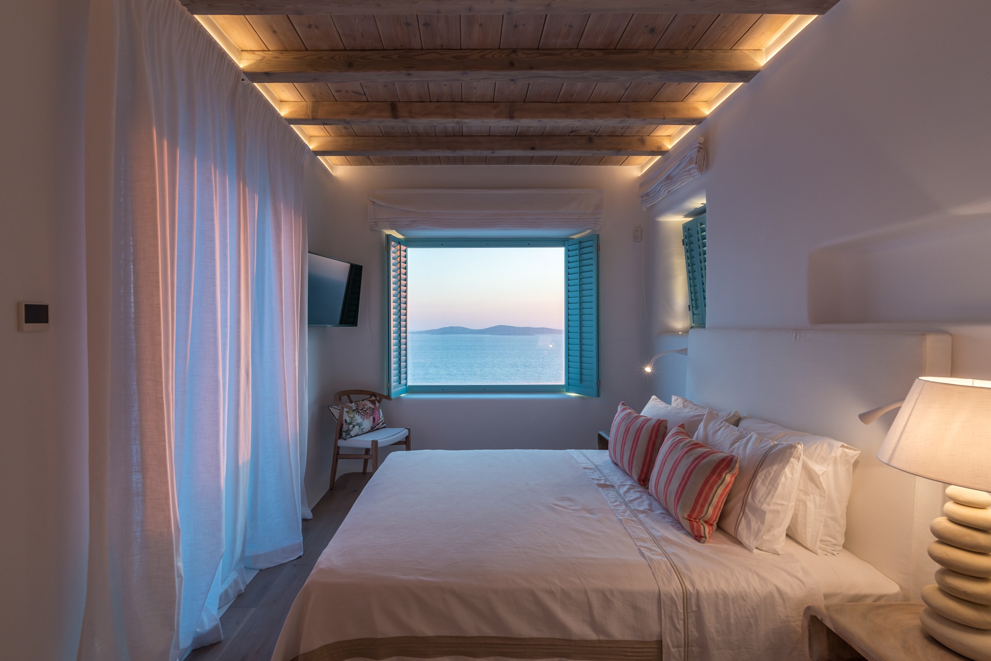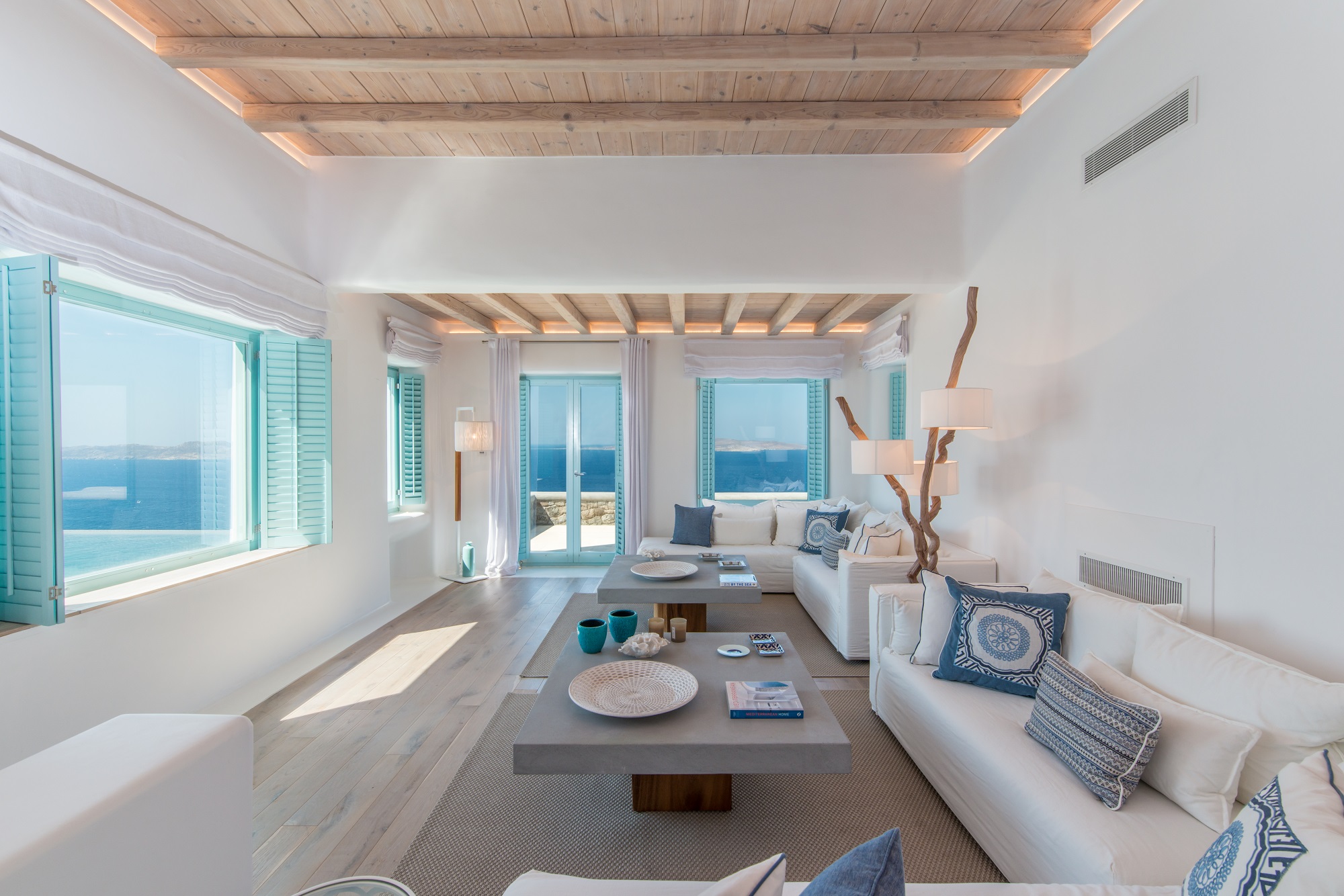 The floor is made of solid oak boards, the wooden ceiling is made with chestnut lumber, while the wooden details and the warm lighting complement the rustic luxury feel that is inspired by Mykonos itself. The interiors are in the same spirit as the traditional minimalist style of the island: bright white with touches of soft, relaxing blue, in combination with wood and a bright, light feel.