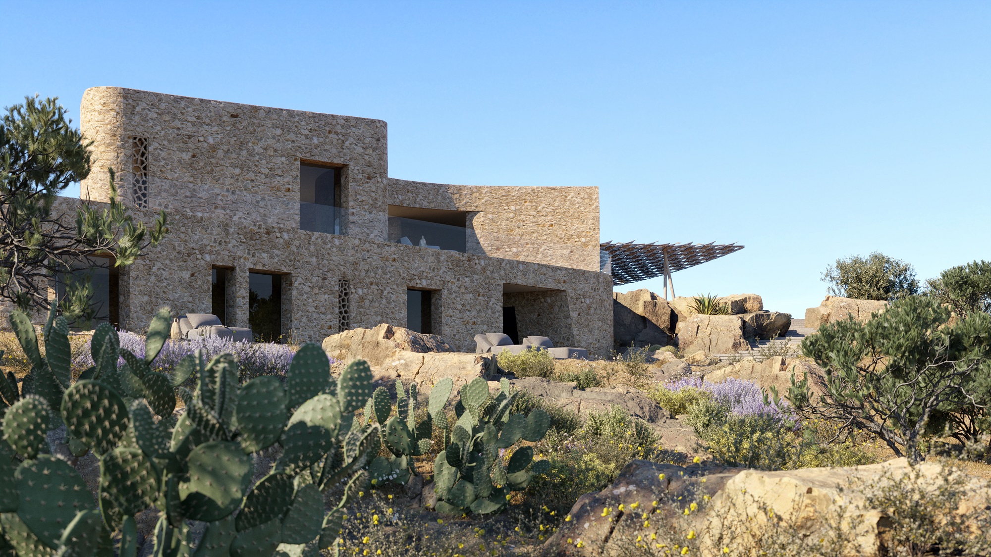 The complex was designed with the aim of creating simple, clear lines. The buildings have one level and assimilate into their surroundings. The combination of above ground and underground structures, of covered spaces and accessible roofs creates a special, interesting whole that integrates with the Asini landscape. The stone walls, the outside insulation system, and the planted roofs keep the residences cool in the summer and warm in the winter. The carefully placed openings ensure natural air flow and air conditioning, as do the light and air openings on the ceiling. The surrounding space includes paved clearings and stone support walls, while the setting is completed by old olive trees, cypresses, as well as new vegetation.