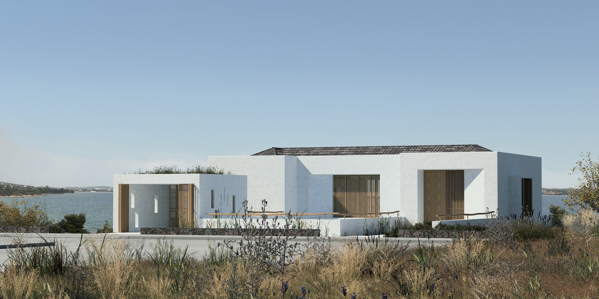 Separate residences placed in such a way that ensures visitors’ privacy. The overlapping roofs create a whole that visually matches the surrounding landscape. The apartments are amphitheatrically built, in an austere, curved line, reinventing in a more abstract, fluid way, the typical terraces of the Greek landscape.