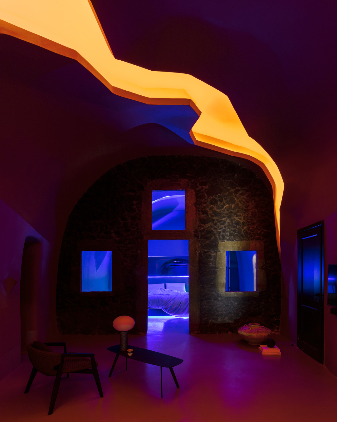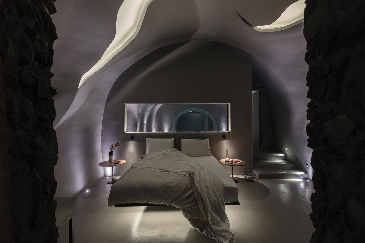 The hotel is a ‘black sheep’ standing out among the blazing white architecture around it. It is comprised of 30 stylish rooms, each presenting a contemporary cave-inspired design. Think polished concrete accents, luxurious king-size beds, edgy and artistic touches and lighting, and bathrooms that mimic natural grottos with robust stone basins and cascading rain showers. A select few rooms offer the added indulgence of private pools, promising an extra layer of exclusivity.