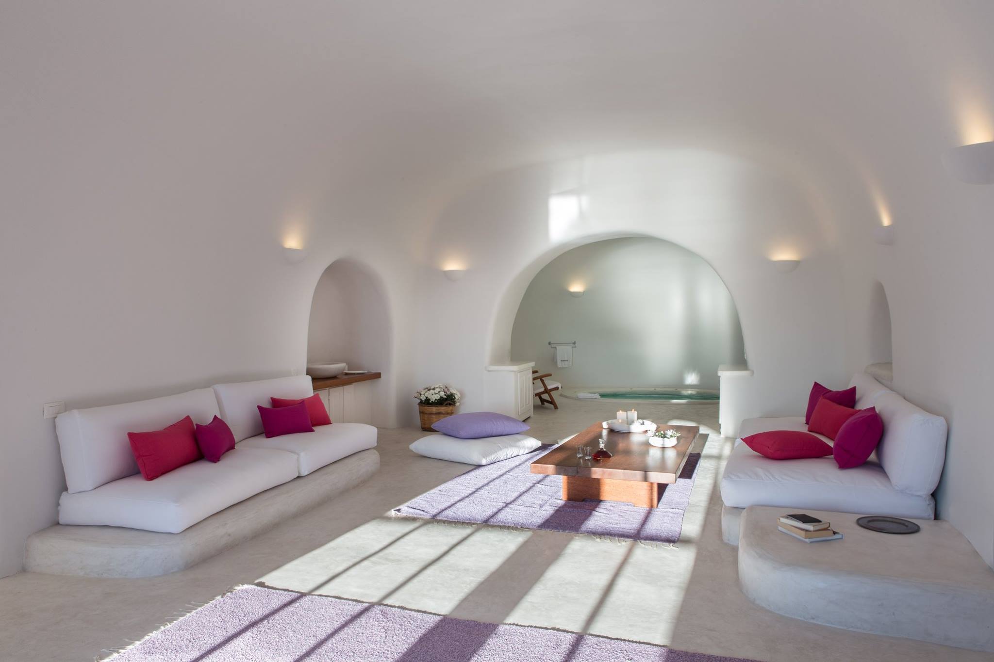 Accommodations are sophisticated and cozily comfortable, with low-slung beds nestled in niches and windows that artfully frame the caldera. Luxuries vary across eight room categories, with the top-tier suites boasting private plunge pools, steam rooms, and secluded terraces, ensuring privacy and exclusivity.