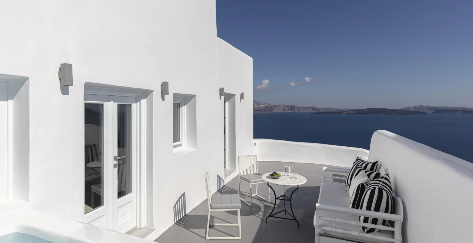 Heated swimming pool, comfortable sunbeds and lounging area with views of the Caldera; the hotel’s most luxurious suite also boasts an indoor pool, a steam room, a pillow menu with 7 choices and 24-hour room service. You will also be able to gaze at the view and the sunset from your bed, through the large windows, and watch the houses and caves of the island turn golden under the setting sun.