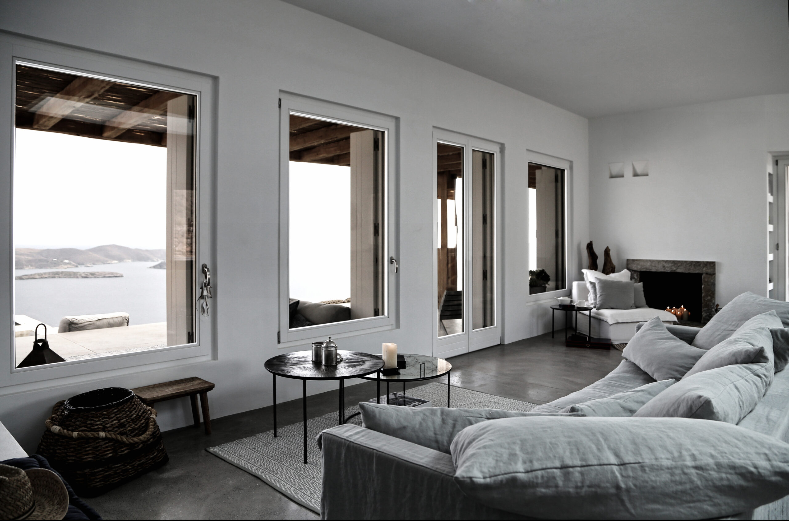 The original rectangular volume with its large openings –passages on all sides- conveys the feeling that there are no cul-de-sacs; the Aegean opens up new horizons. As the architectural description of the building puts it “The volumes are set next to each other, under a united roof slab, facing the magnificent view of the bay”.