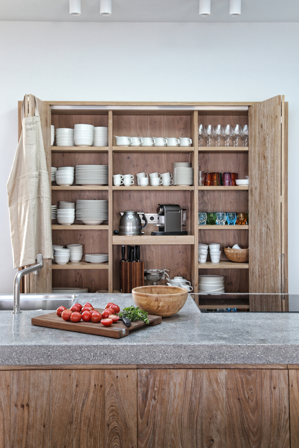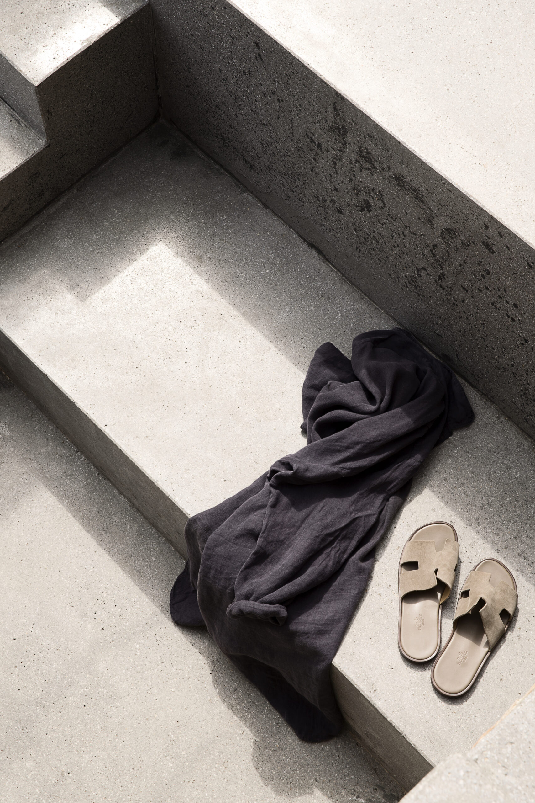 The entrance lies at the back of the building, following a gentle descent through small courtyards planted with local aromatic herbs –the scents and aromas have been carefully selected so that the environment elevates the senses to a higher level. The main volume of the building houses the public areas, while the slightly higher volume, covered in local masonry, houses the couple’s private space.