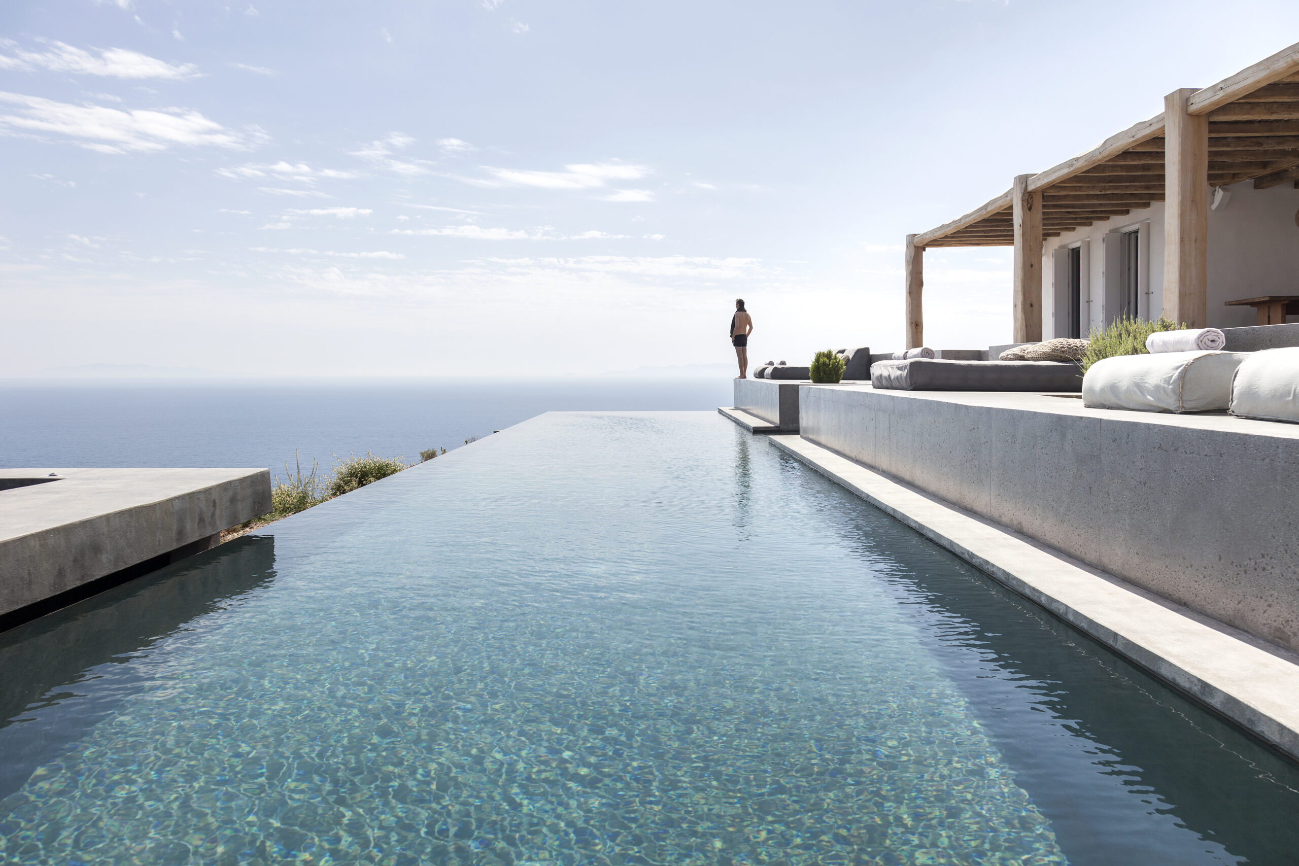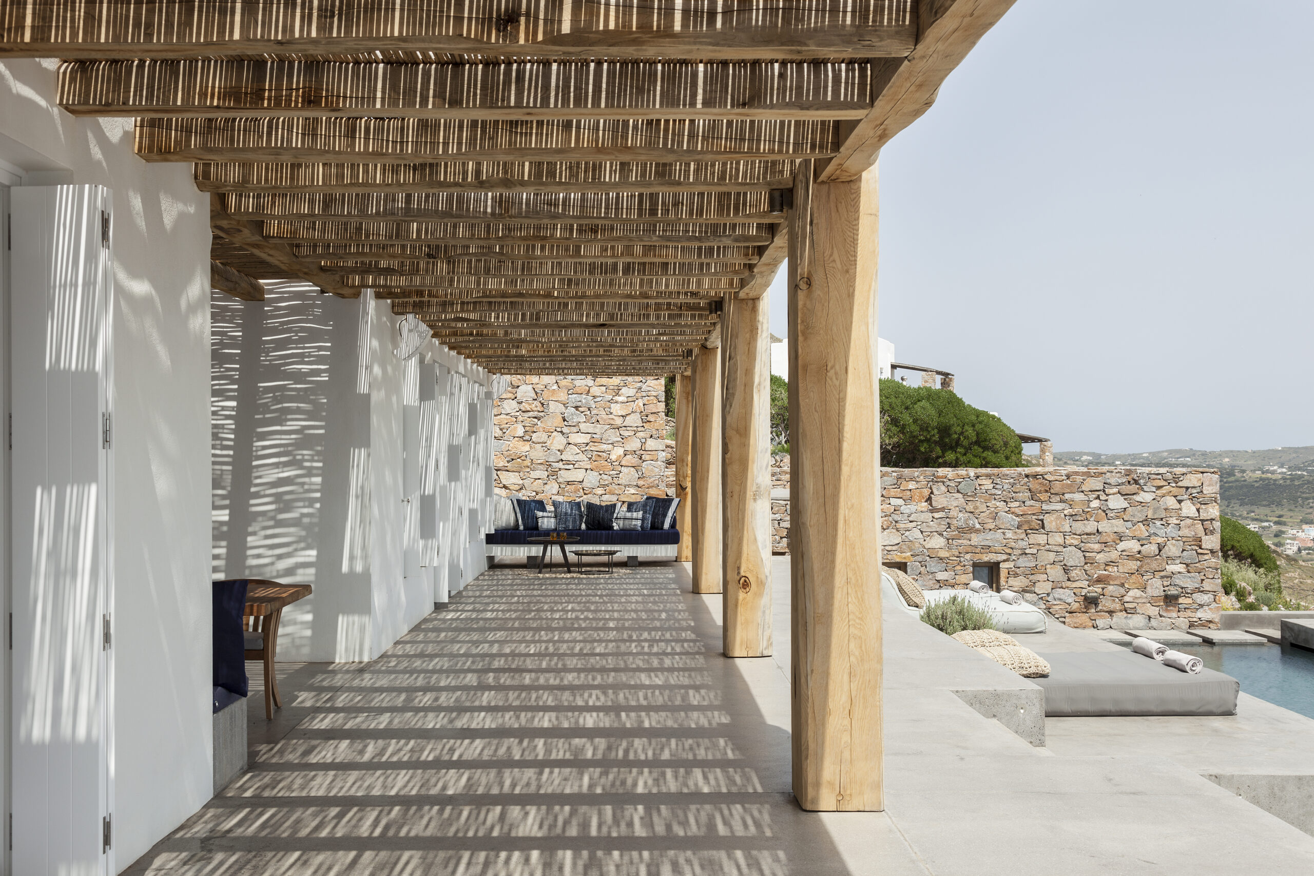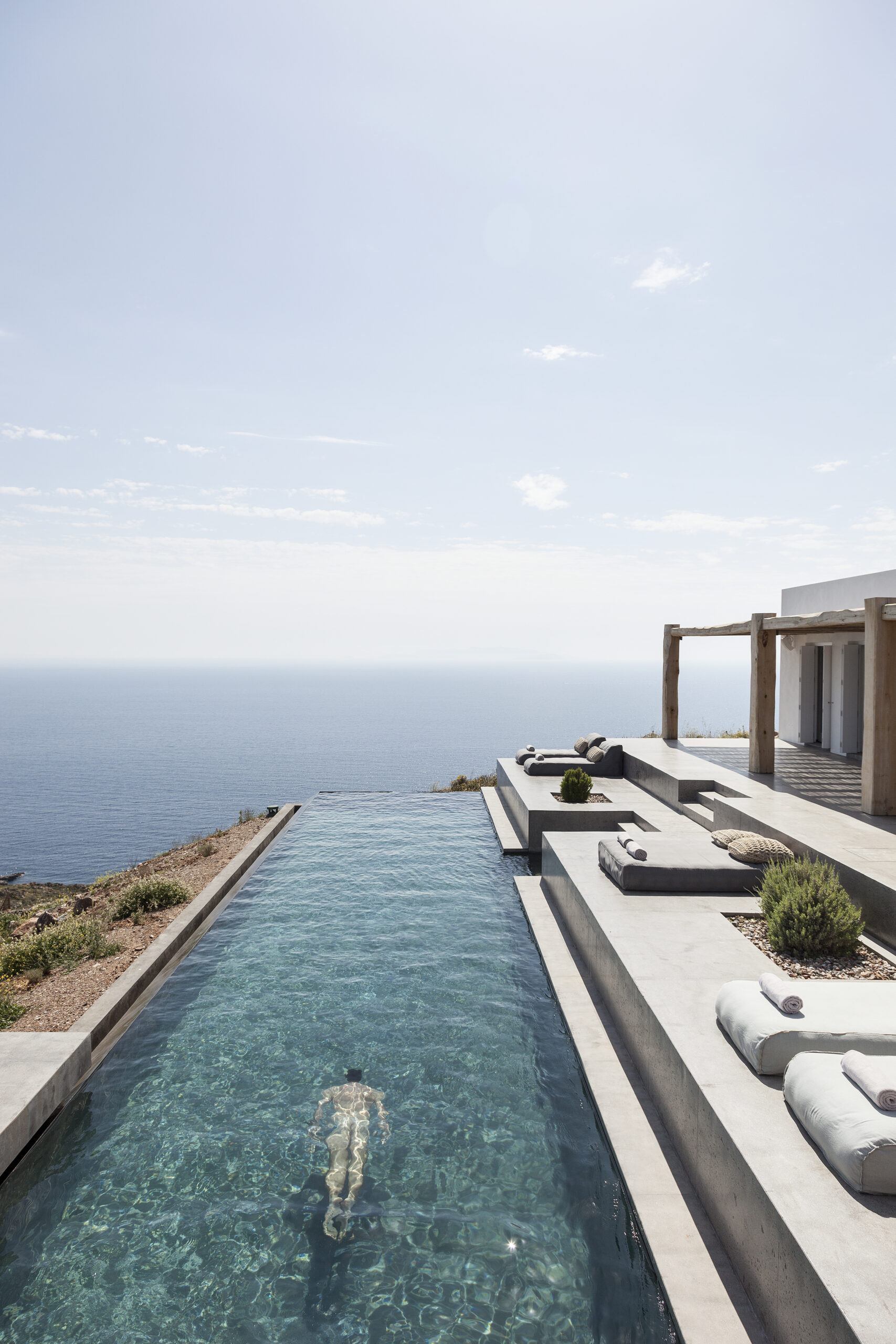 The design of the four guesthouses was significantly varied. The main desire was to create spaces that would be independent but would also have direct access to the pool and the common areas of the main building. The configuration of the outdoor area follows the topography of the natural landscape through paths and different levels that define areas of relaxation either exposed to or protected from the sun. This gives one the feeling of being in a shell; a sense that the building has always existed, as part of the natural landscape. The heart of the building lies in the space between the main house and the guesthouses, where, during the sunny summer months, everyone can relax and enjoy the Aegean.
