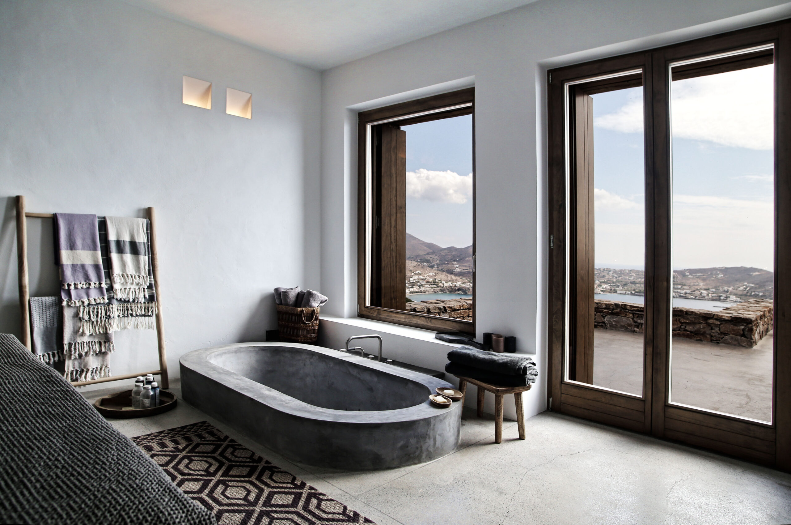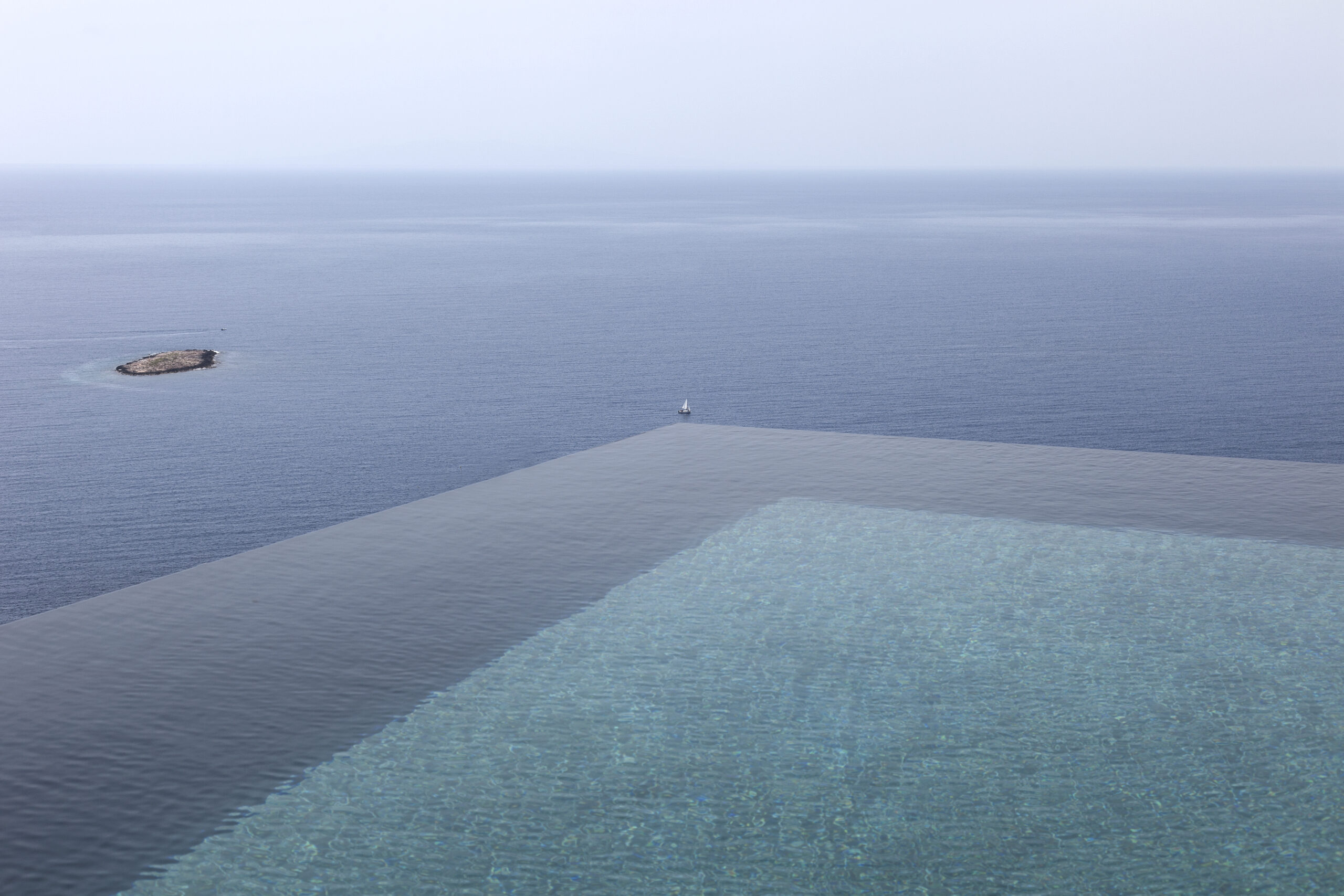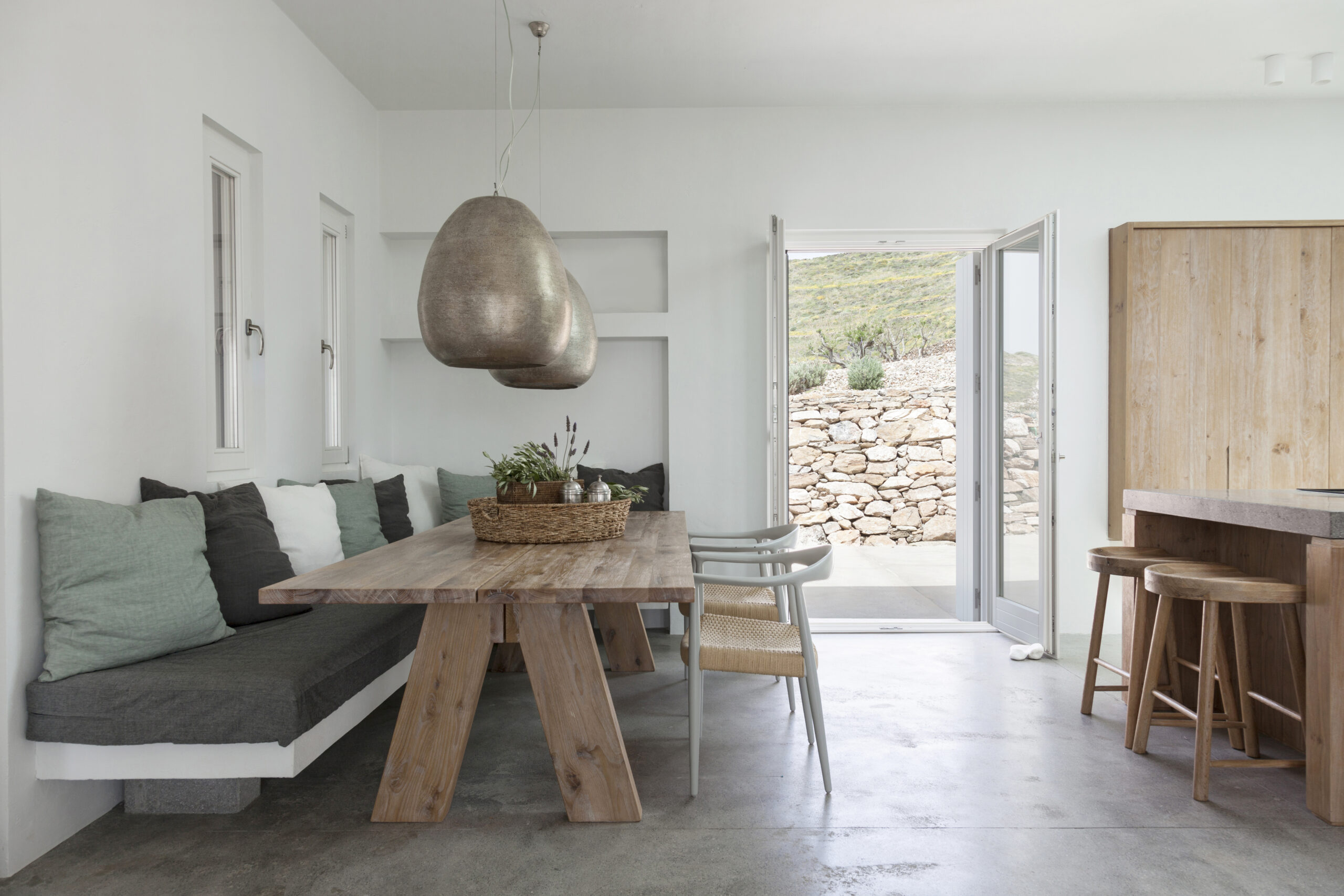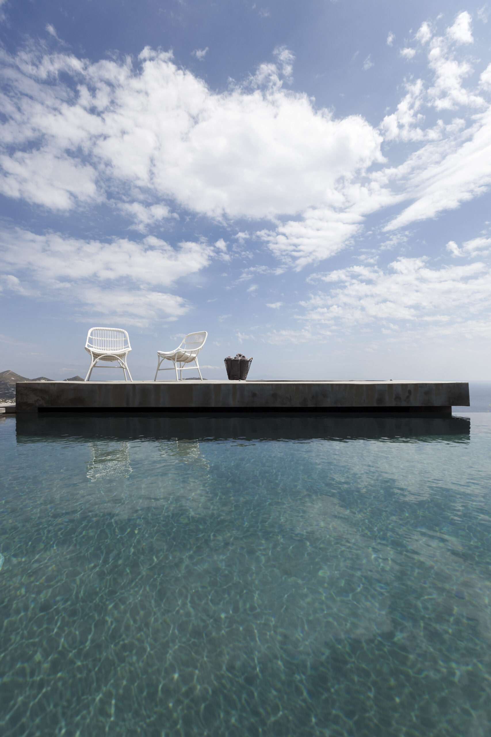 The design of the four guesthouses was significantly varied. The main desire was to create spaces that would be independent but would also have direct access to the pool and the common areas of the main building. The configuration of the outdoor area follows the topography of the natural landscape through paths and different levels that define areas of relaxation either exposed to or protected from the sun. This gives one the feeling of being in a shell; a sense that the building has always existed, as part of the natural landscape. The heart of the building lies in the space between the main house and the guesthouses, where, during the sunny summer months, everyone can relax and enjoy the Aegean.