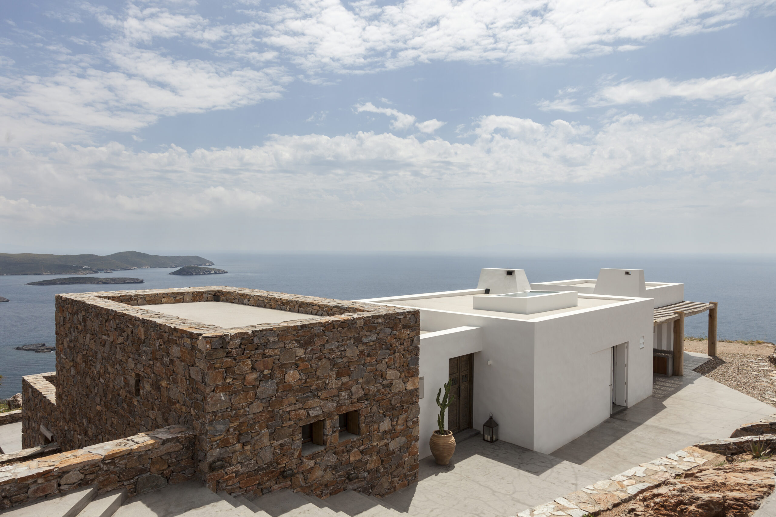 A 200 sq.m summer residence offering the maximum possible view of Plagia bay from every angle, able to host a sociable couple and their company, as it features four guest rooms. The building gives the impression that no matter how many disparate spaces it has, the whole is unified under one single roof slab, overlooking the Aegean Sea.