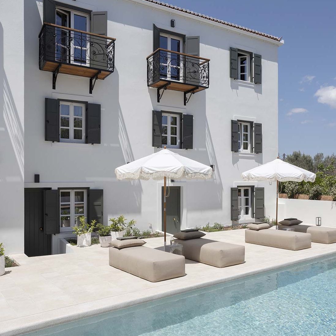 Orloff Resort, a harmony of renovated early-20th-century buildings, encircles a garden courtyard with a 72-foot pool. Perched above the old harbor, many rooms boast views of red-tiled roofs, vibrant bougainvillea, and the sea beyond. Tasteful interiors blend antique and modern, with minimalist whites and grays adorned with bright color accents.