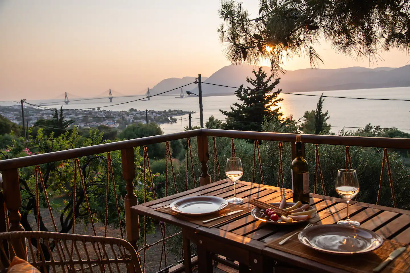 Reconnect with nature while enjoying panoramic sea views and sights of the iconic Rio-Antirrio Bridge at this wonderfully scenic place. This luxurious wooden structure is designed with comfort, relaxation, and safety in mind, situated on a fenced plot with screens on all windows. Amenities include AC, Wi-Fi, free on-site parking, and a private patio or balcony. Relax looking out at endless verdant mountain views, with shared access to a nearby beach. A car is recommended for easy access.