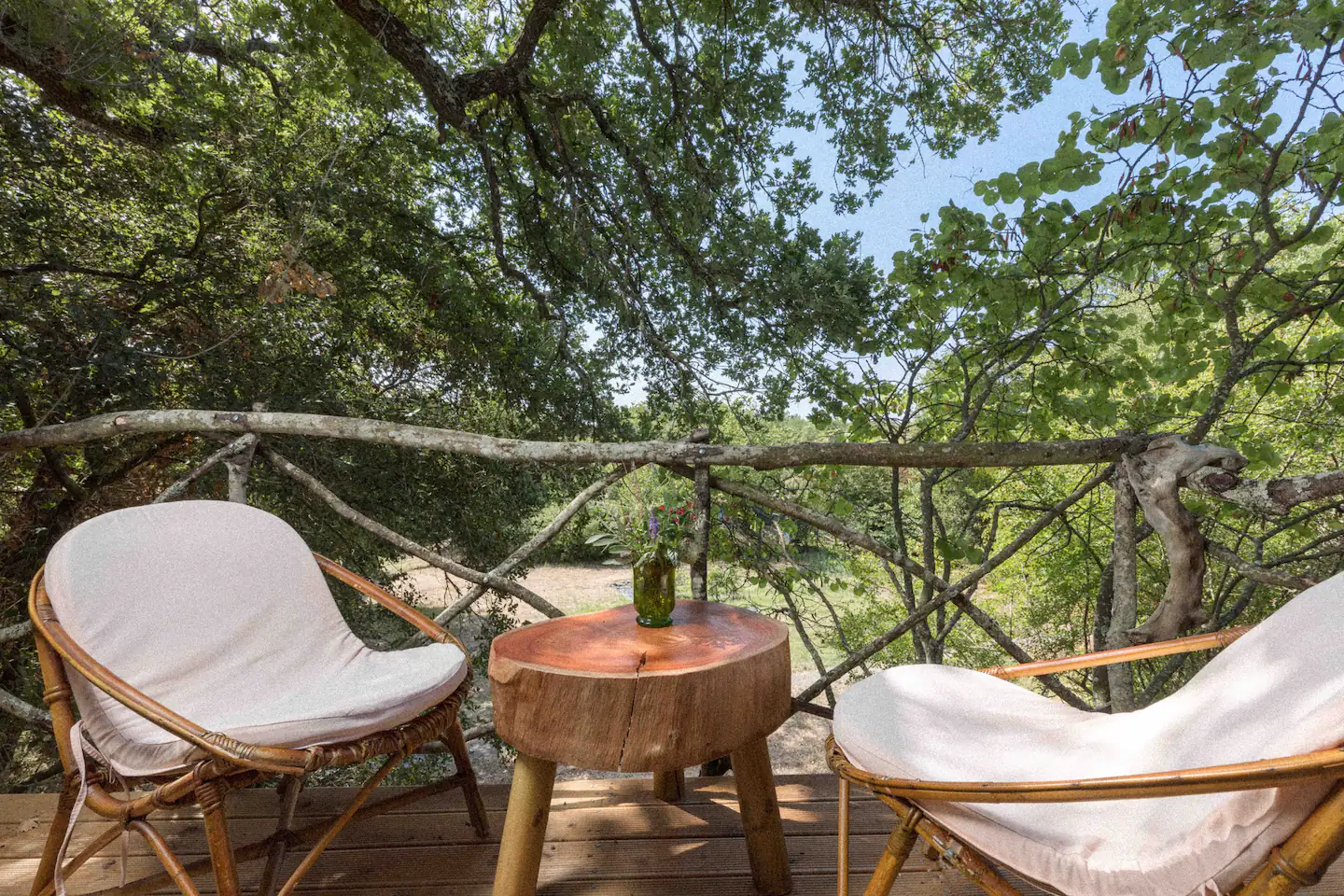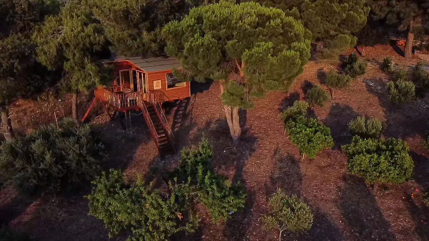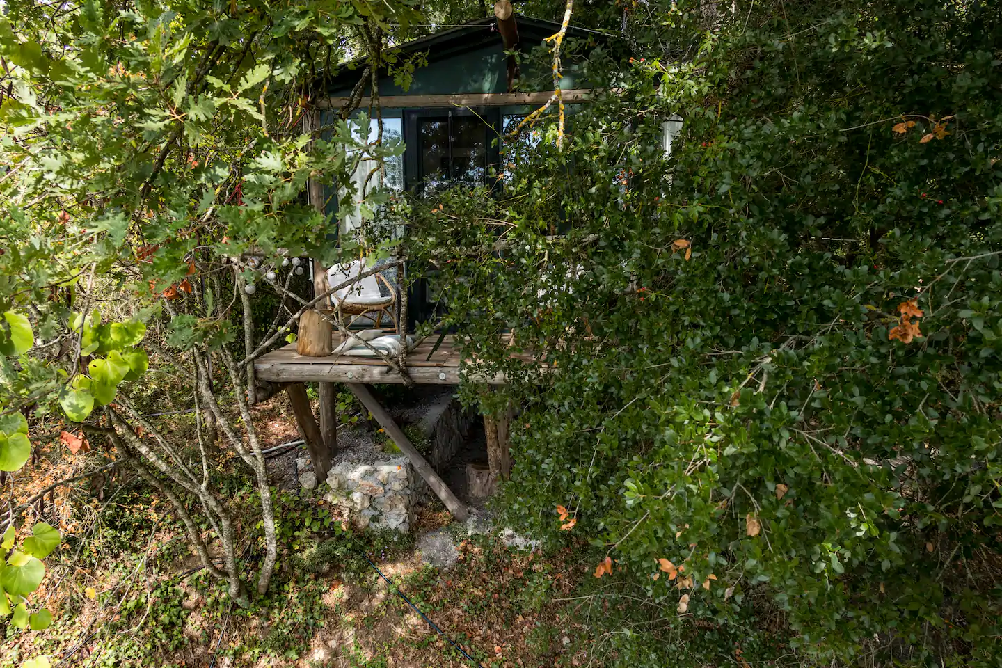 This treehouse is on a property named Ktima Vradi (Vradi Estate) at the foot of Ano Korakiana, an old mountain-slope village in Corfu. It is surrounded by a forest, creating a romantic setting. The treehouse is flooded with natural light and offers a marvelous view of the lush landscape. Its details and tasteful fabrics create a unique atmosphere, and it has heating, AC and Wi-Fi. A large number of lovely cats and dogs live freely on the property.