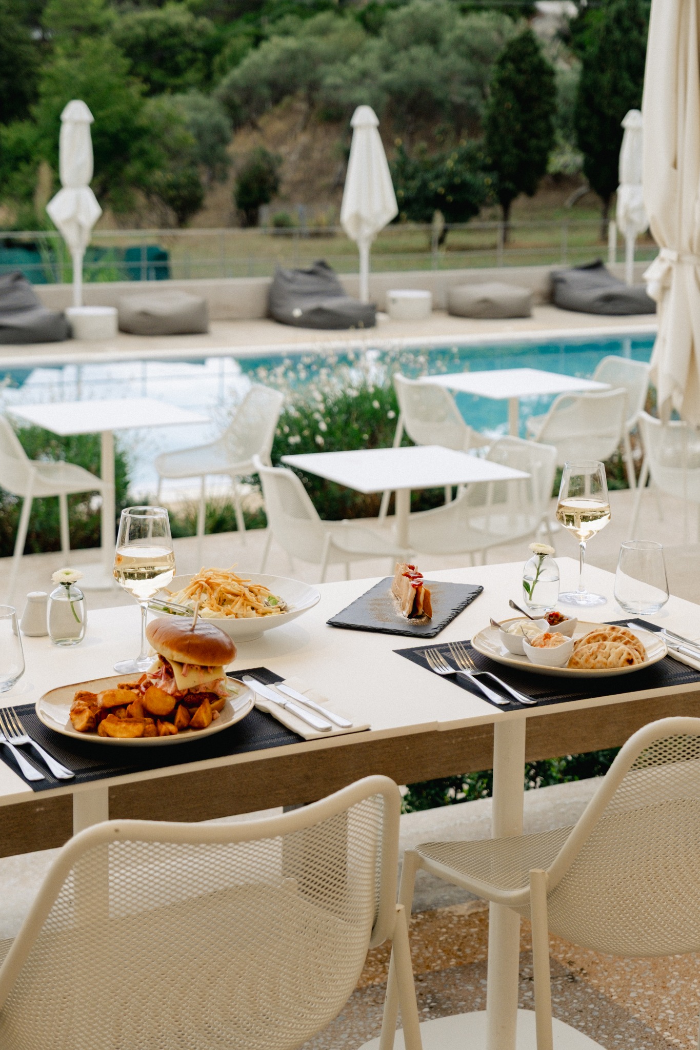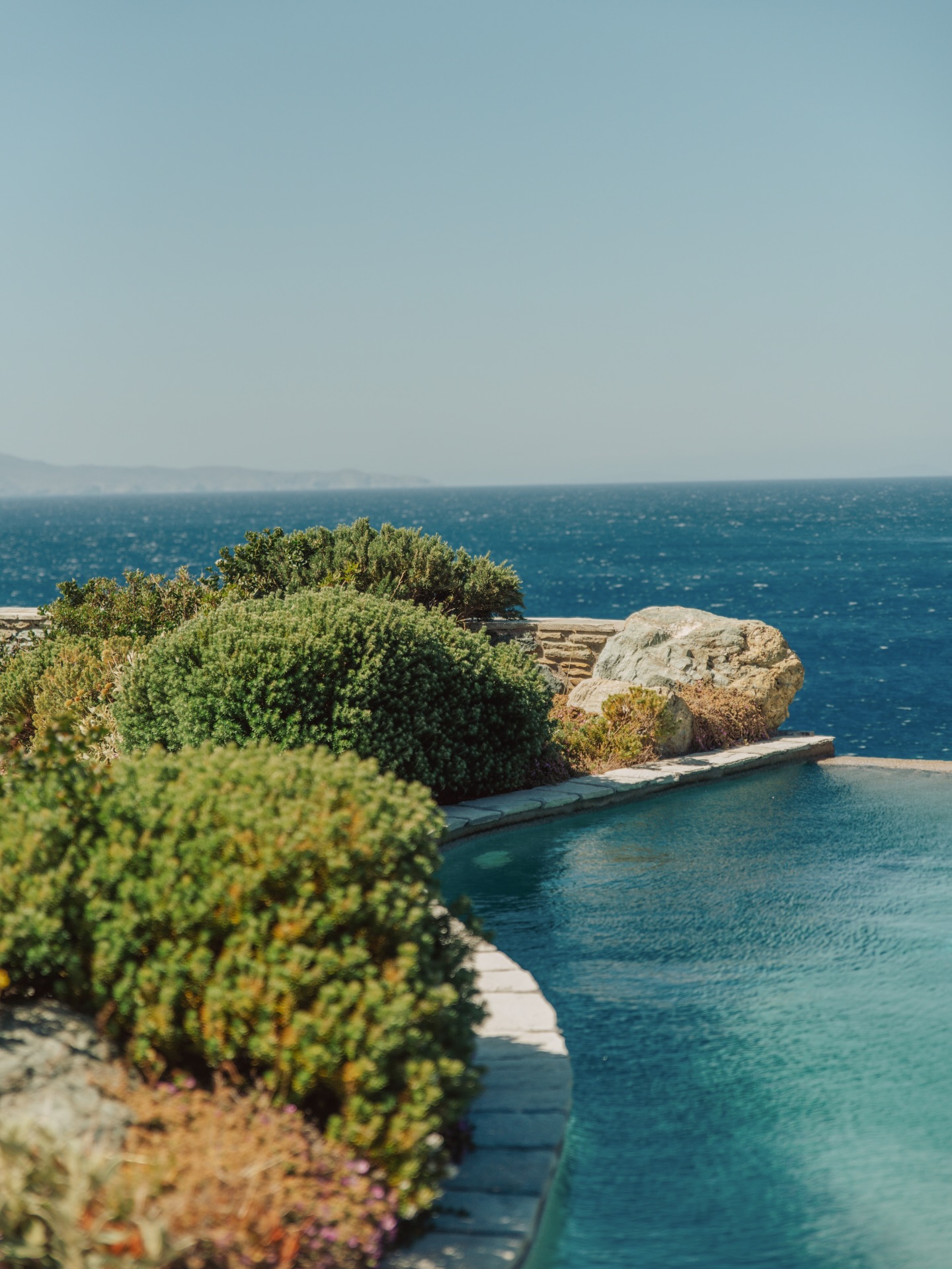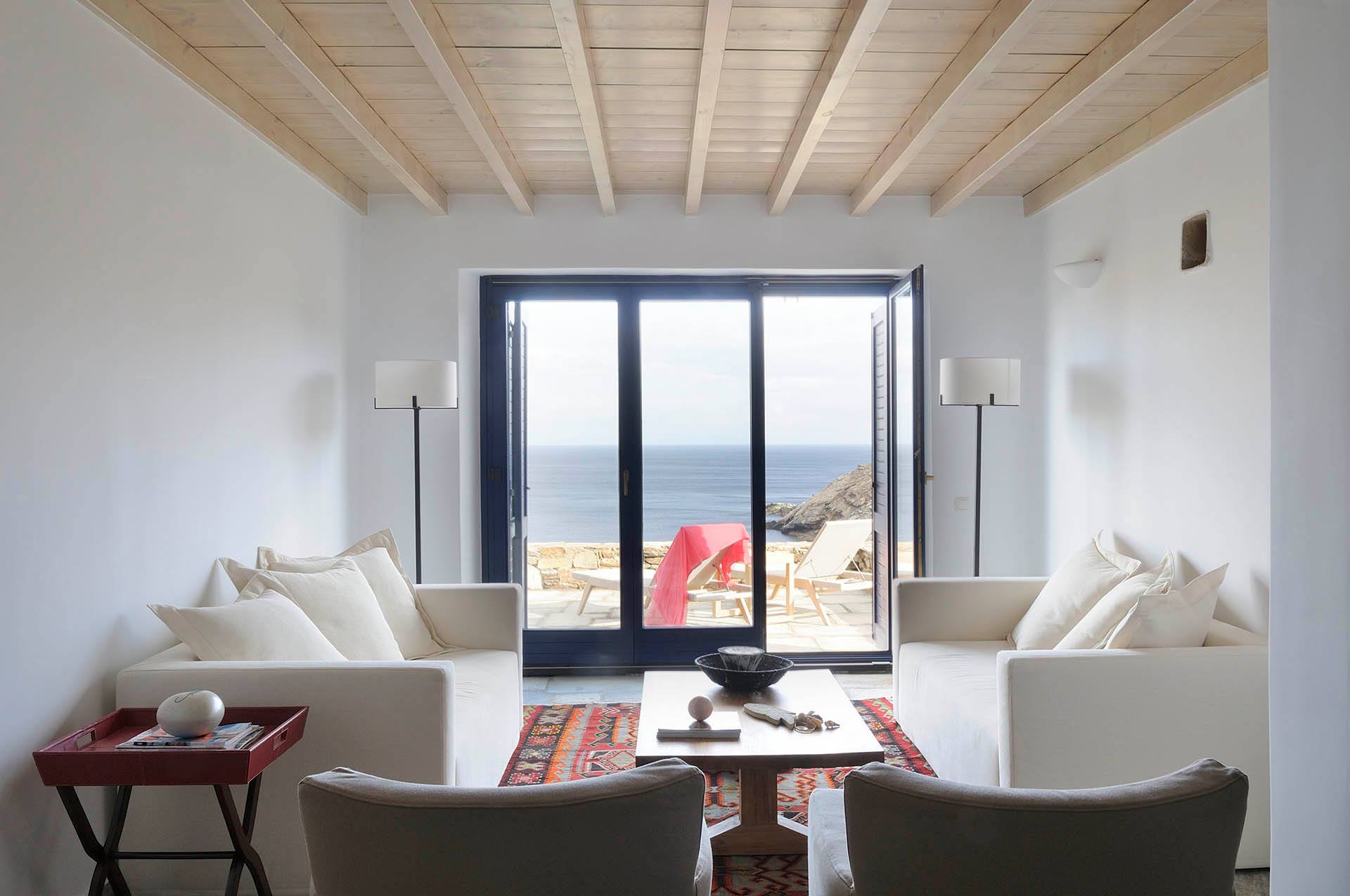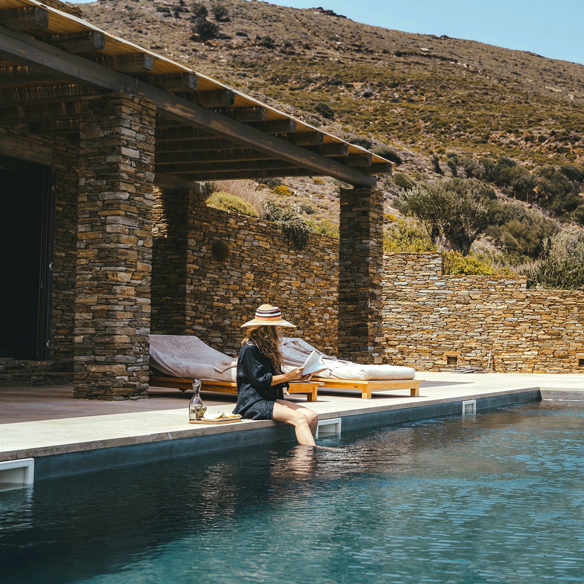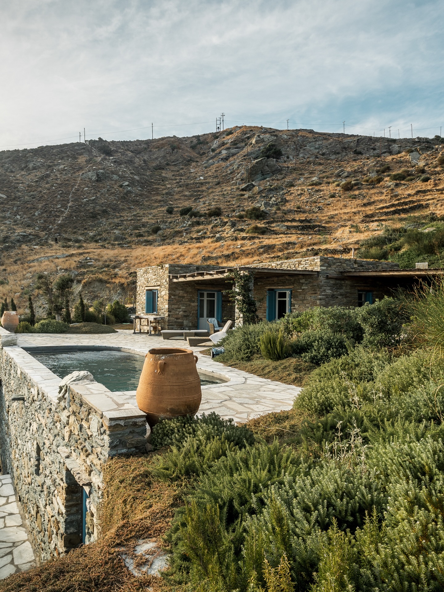 Instead, hospitality here unfolds at a more intimate scale. In Chora, neoclassical townhouses from the 19th century have been quietly restored, their marble staircases and painted ceilings intact. Above Batsi, clusters of suites step down the hillsides, whitewashed and wind-brushed. Near Gavrio, family-run beachfront hotels have been welcoming summer regulars for decades. Elsewhere, discreet villa compounds occupy secluded coves, polished but never performative.