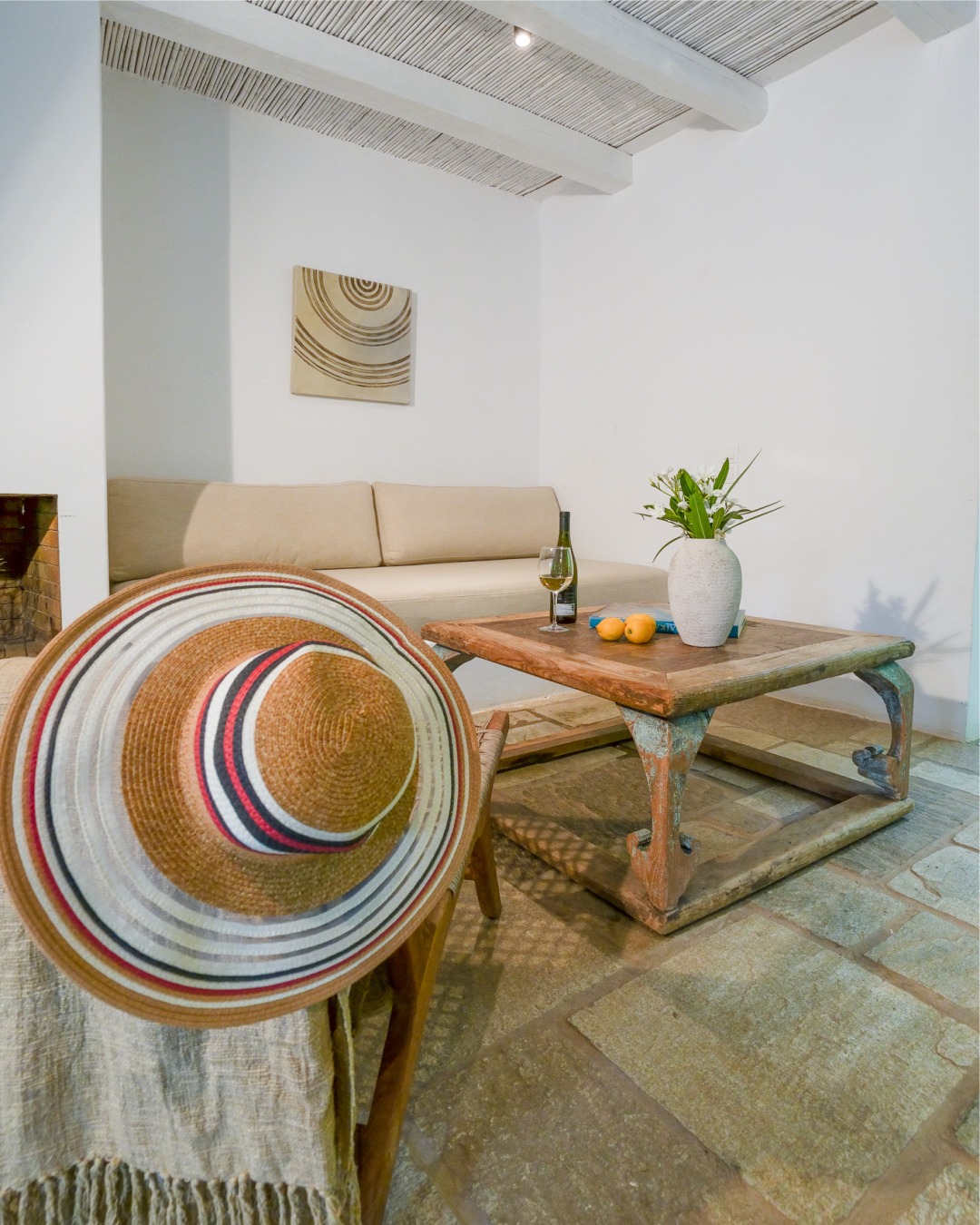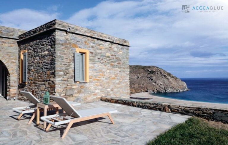 Located near Achla Beach on the island’s eastern side, this getaway immersed in nature consists of independent stone cottages set within landscaped gardens, between what is arguably Andros’ most beautiful beach, Achla, and the river. Each unit includes a kitchenette, private outdoor seating area, and simple built-in furnishings. An on-site restaurant operates during the season with a menu based on local produce, and yoga and other retreats are regularly hosted here. The road requires a vehicle, and the setting is remote relative to Chora. The format suits guests prioritizing contact with nature, wellness, seclusion and direct access to one of the island’s most distinctive shorelines.