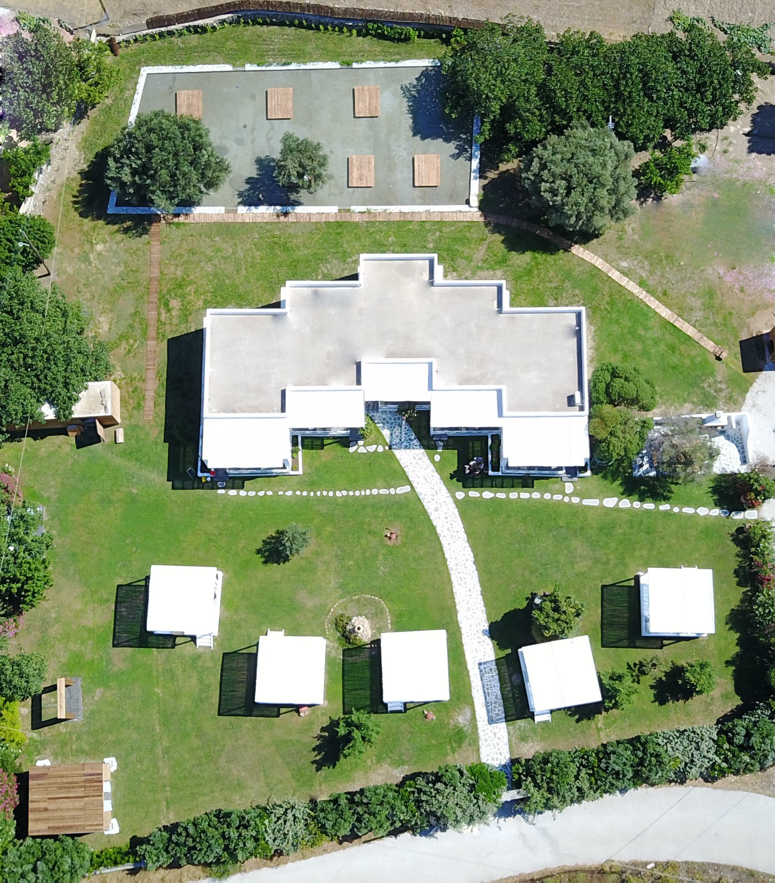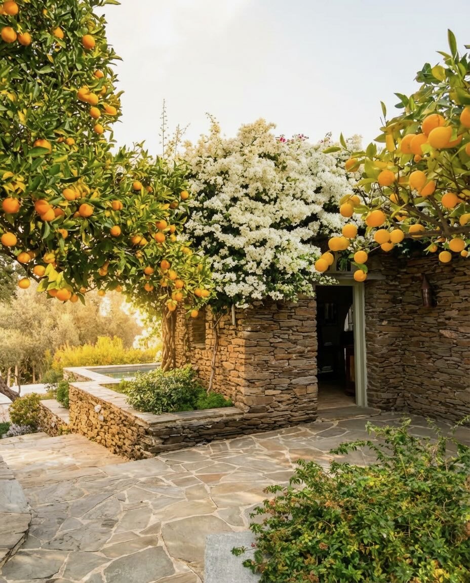 Located in a semi-rural setting a short drive from Chora, this small guesthouse occupies a restored estate surrounded by citrus trees and gardens. Rooms are individually arranged with tiled or stone floors, earthy furnishings, and private entrances opening onto outdoor areas. Breakfast highlights local produce and homemade preparations served on shaded terraces. The property does not operate as a full-service hotel; it functions as a country guesthouse suited to guests combining visits to Chora with exploration of nearby beaches and inland villages.