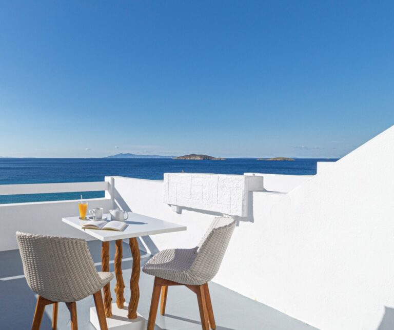 Located in Kato Agios Petros near Gavrio, this contemporary boutique hotel comprises a limited number of rooms and suites arranged across a low-rise structure. Interiors are clean, minimal and fresh, with gray tones, stone and tile, as well as neutral decor items and modern bathrooms; selected categories include outdoor hot tubs, garden views or private terraces. A swimming pool and sea-view breakfast terrace serve as common areas. Saint Peter’s Beach and the port are within short driving distance. The scale and layout suit couples seeking modern accommodation near the ferry gateway.