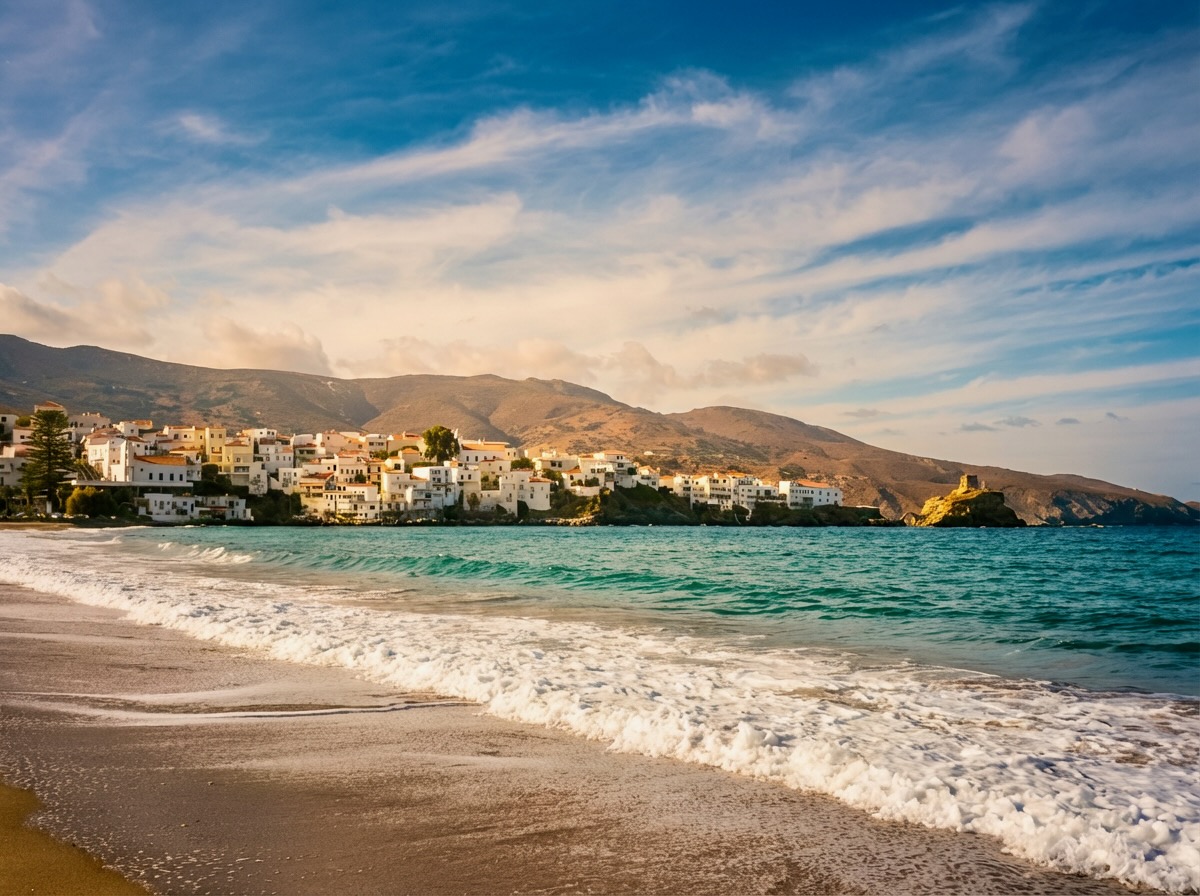 Established in the 1970s on Kypri Beach near Agios Petros, this seaside hotel provides direct, family-friendly access to sand and shallow water, and less wind than most other areas on days when the island famously gets blitzed by the meltemi (not a rare occurence on Andros). Most rooms and suites include sea-facing balconies arranged along the shoreline. The hotel is known for the tasty food at its Mediterranean restaurant, beach bar, and sunbeds. The property operates seasonally and is located a short drive from Gavrio port, making arrival and departure straightforward. Its position favors guests who want immediate beach access while remaining close to ferry connections and the island’s western villages.