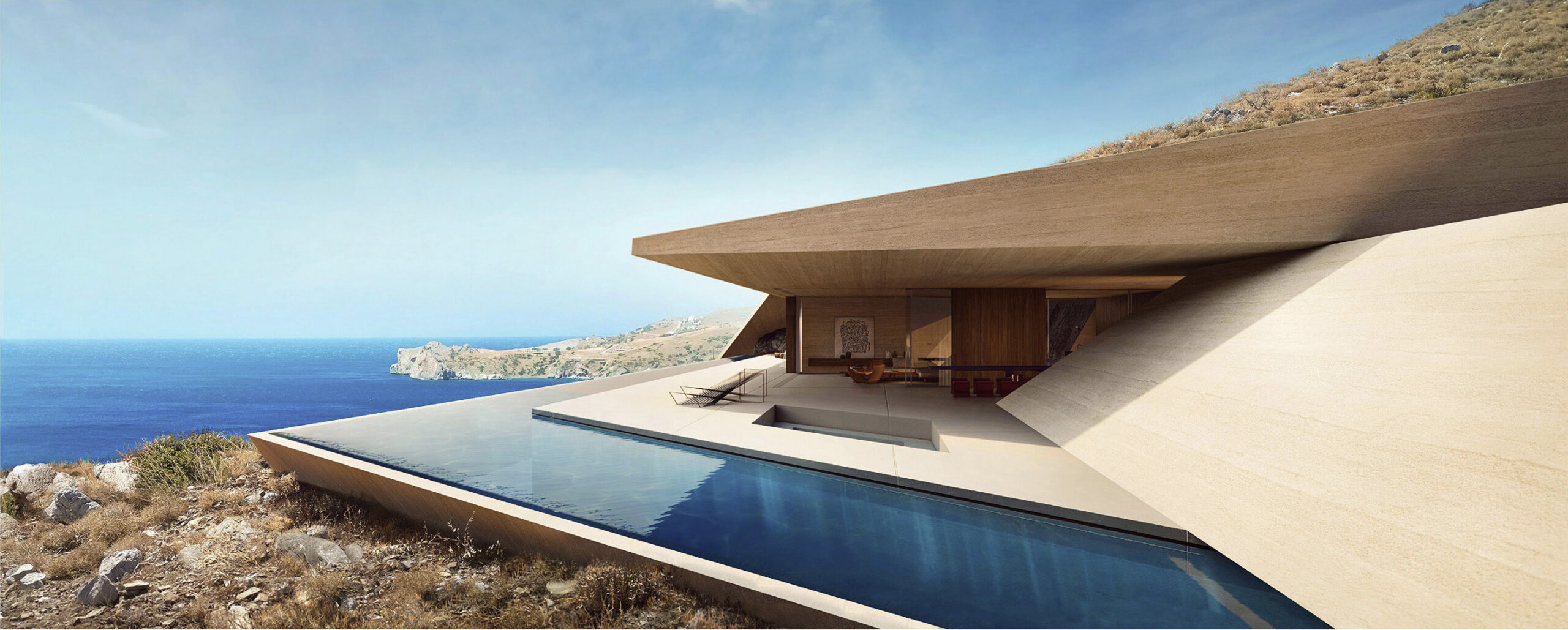 Casa Katana is situated above the rocky formations of the plot, elevated enough to offer unobstructed vistas while maintaining privacy. It is excavated and carefully designed in accordance with the Mediterranean-North African climatic conditions of the area, the orientation, and the movement of the solar light. Natural light and air are delicately filtered, offering well-being and a natural sensation to its occupants.
