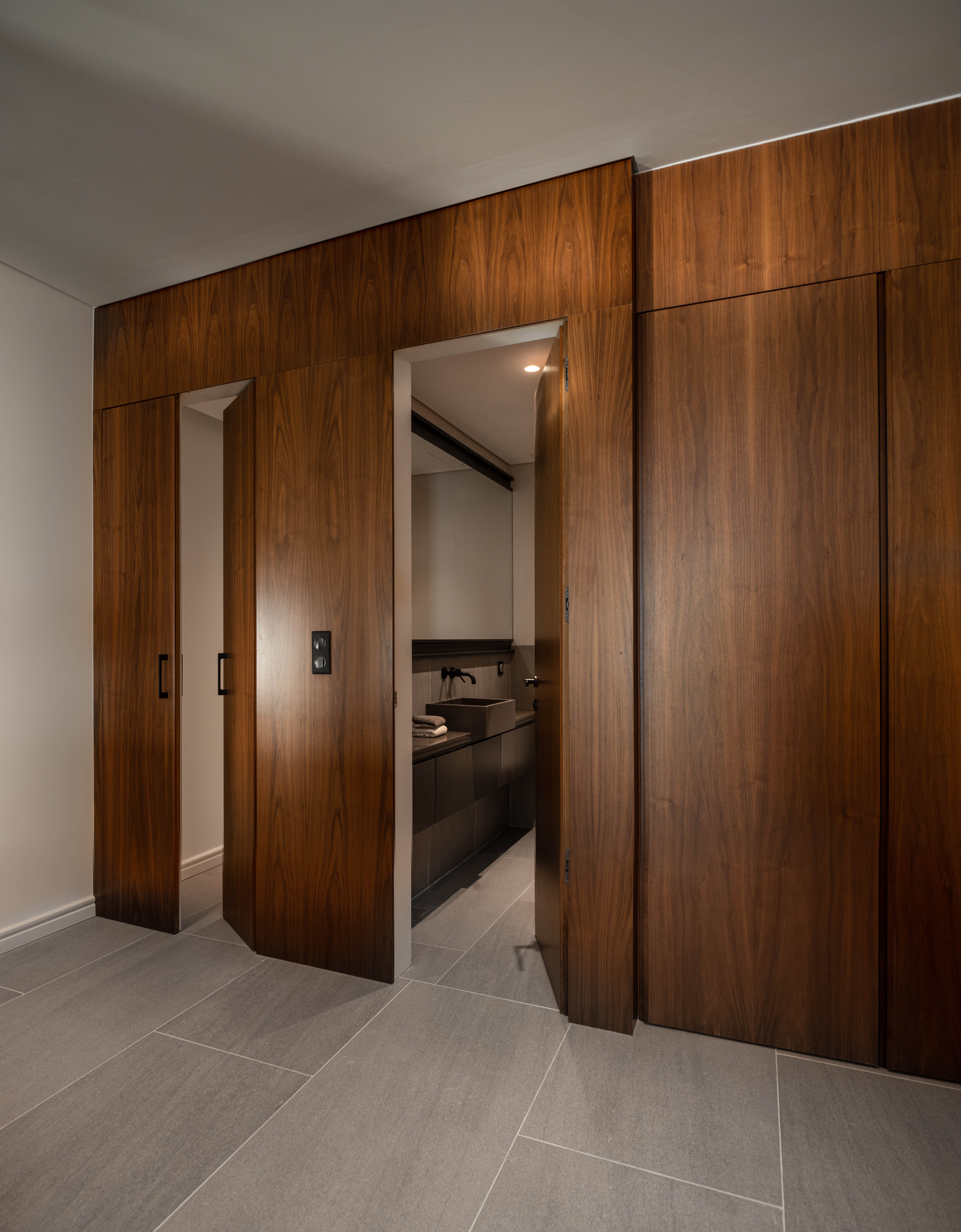 The walnut paneling in the dining room, on the floor, ceiling and walls warms the space. Small terracotta colour details are a pleasant addition and enliven the decorative setting.