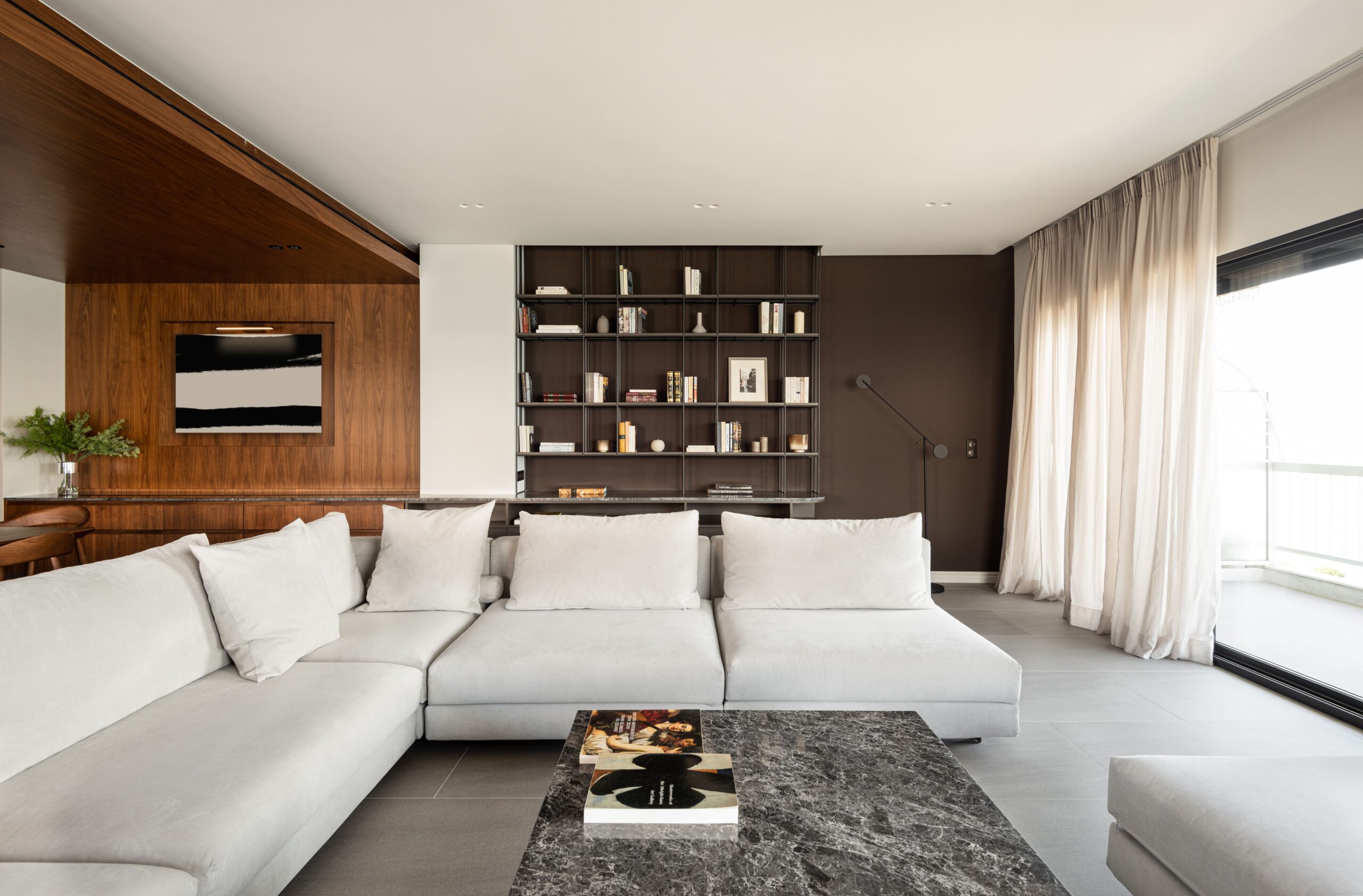 A marble-effect coffee table, gray sofa offering light to the space, and a book shelf occupying the wall behind the sofa to highlight objects of sophisticated character, are the dominant decorative elements of the living room. Three colours, gray, black and white, converse and create interesting contrasts.