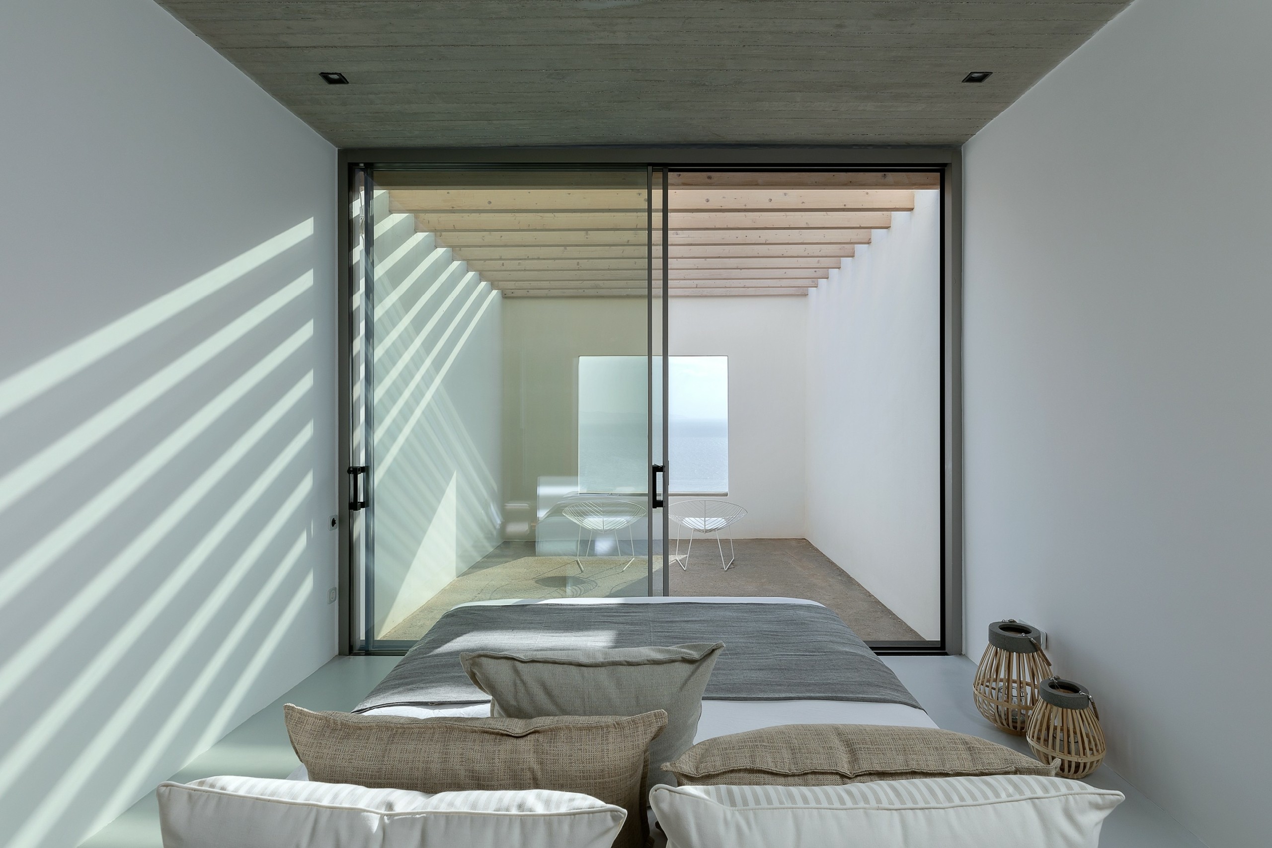 “The two solid structures protruding from the slab vertically to each other and on the other side of the main building are private spaces, one bedroom and one guest room. On the same space there is a protected semi-covered open area that frames the view offering the sense of a refuge” the team of the Aristides Dallas Architects office mentions.