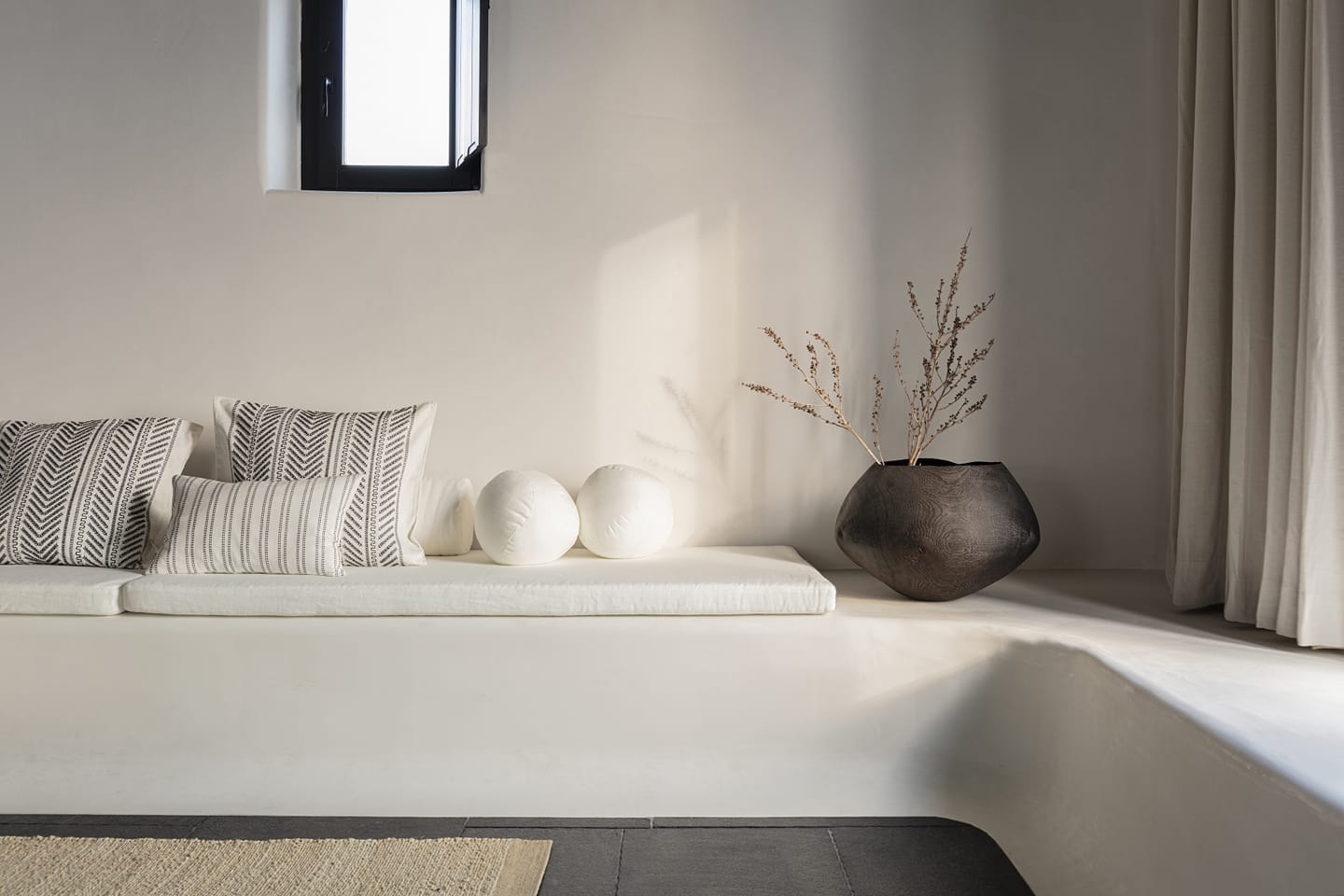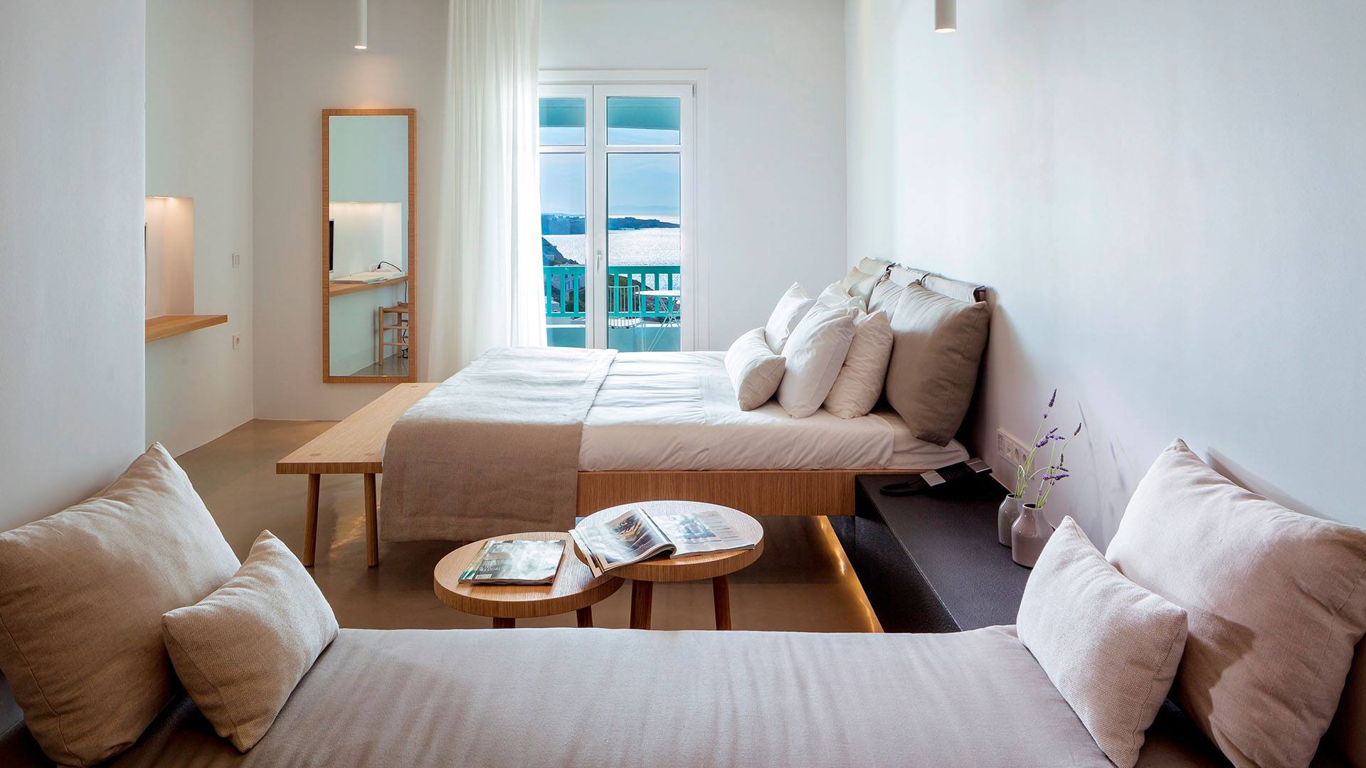 Nomad in Kalo Livadi serves as a retreat to a more conscious kind of luxury. Here, the vibe is stripped down to the essentials – 13 suites that combine simplicity with elegance, decorated in soothing earth tones and featuring Aliveri gray marble bathtubs, private terraces for al fresco dining, and the option for in-suite spa pampering. The building, created with an eco-friendly design, blends seamlessly with the surrounding landscape and is constructed of natural materials from the surrounding area and outfitted with furnishings, linens, and fabrics sourced from organic sources.