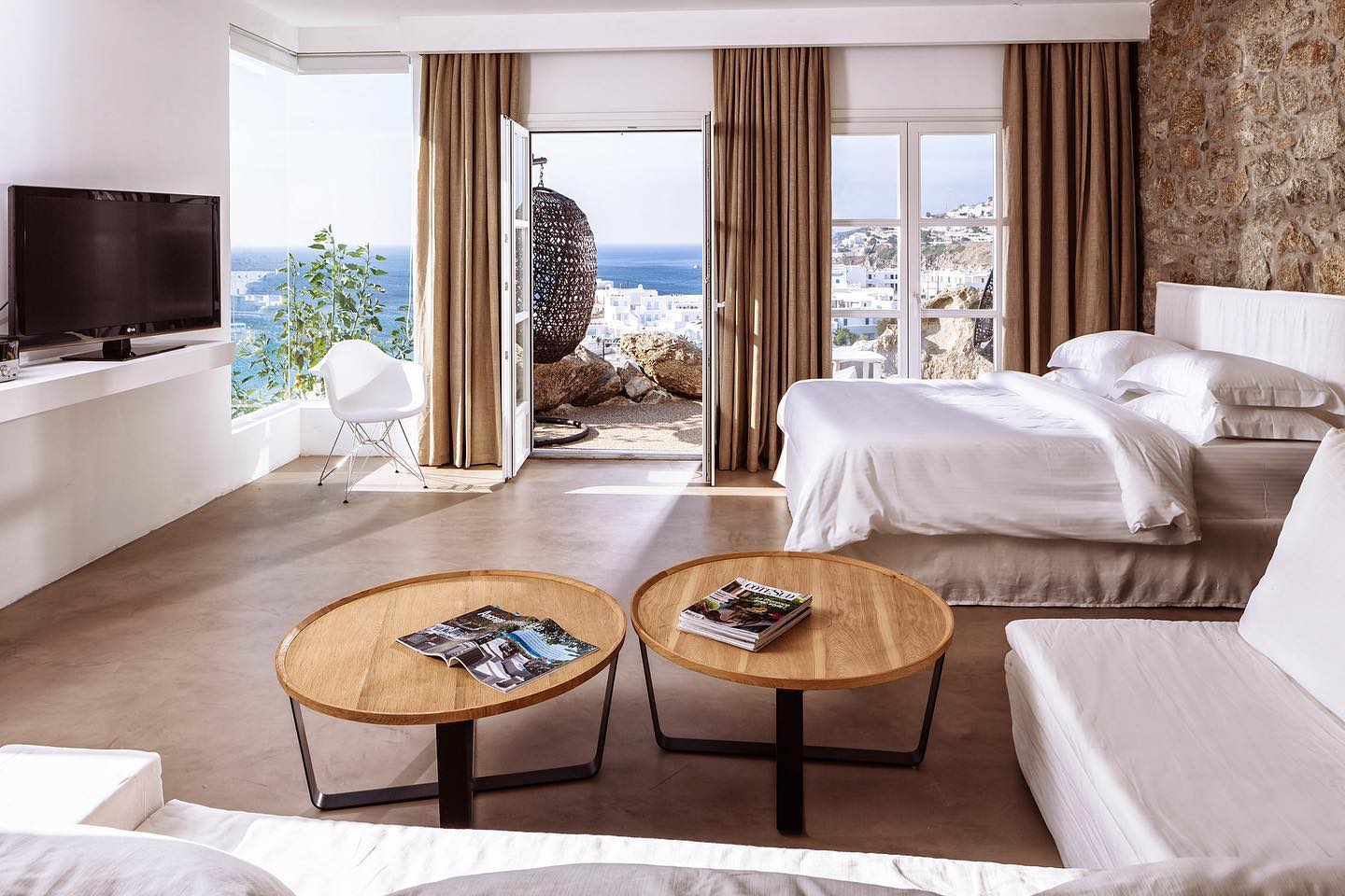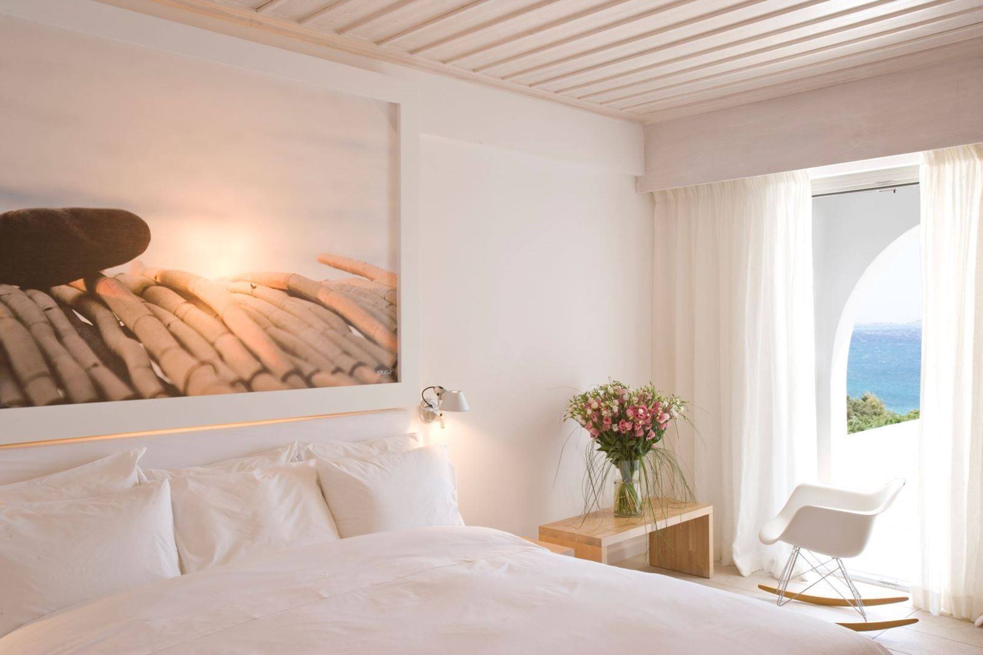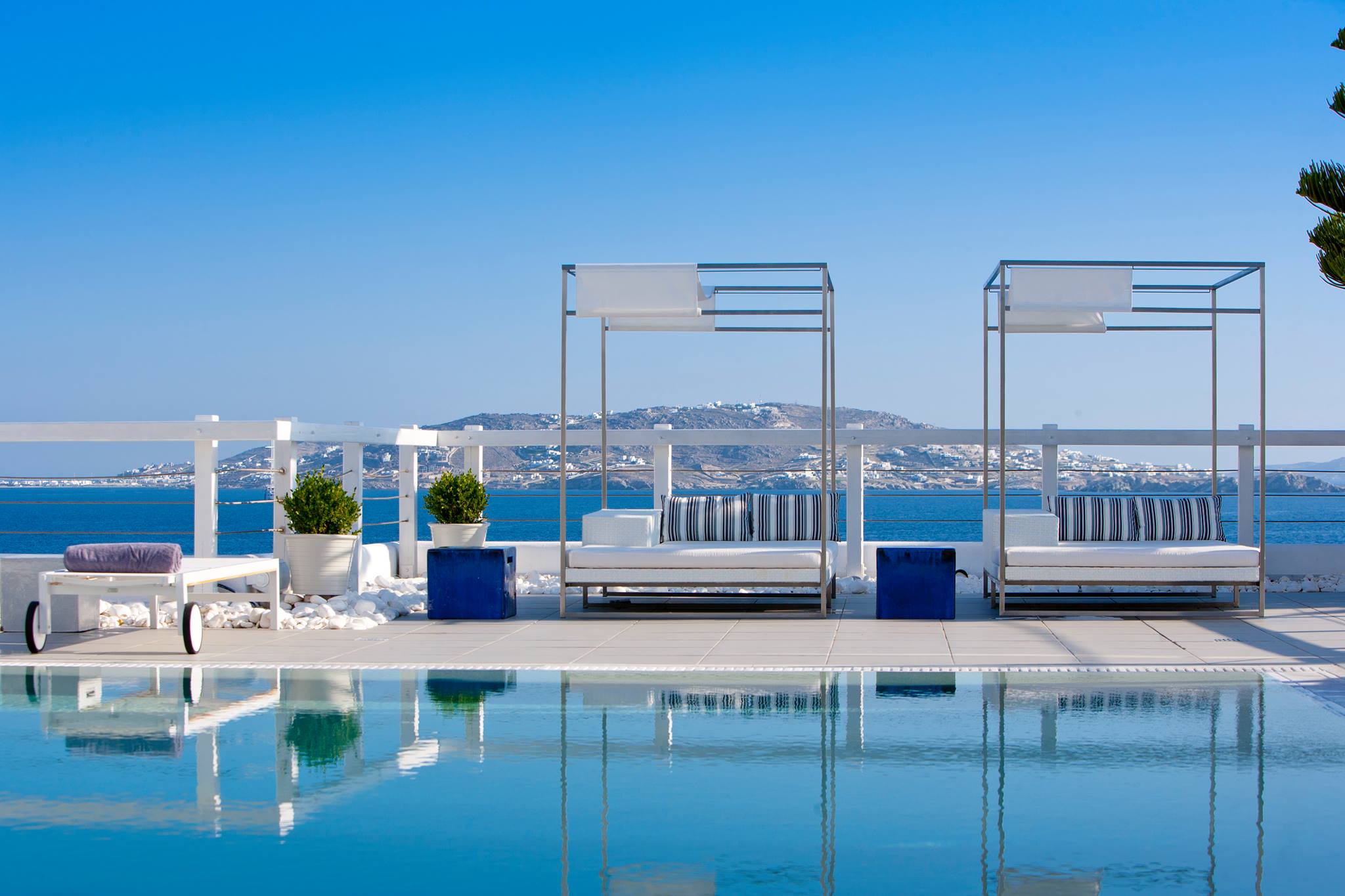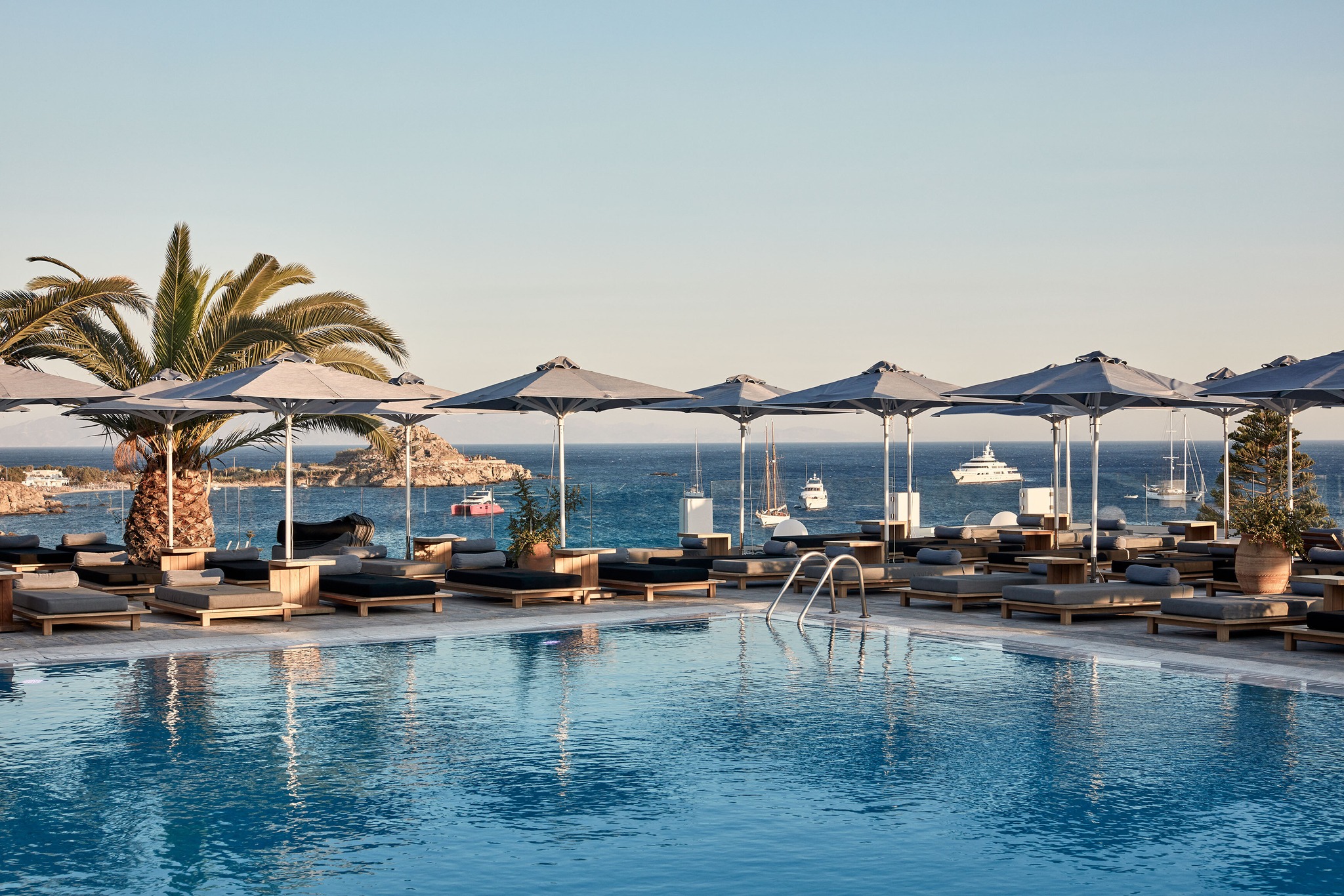 The hotel’s architecture pays homage to Cycladic tradition while embracing modern aesthetics, perfectly situating itself by the sandy expanse over Platis Gialos. From its sumptuous rooms and suites to the pool deck, every element is designed to accentuate the natural beauty of the Aegean without disruption.