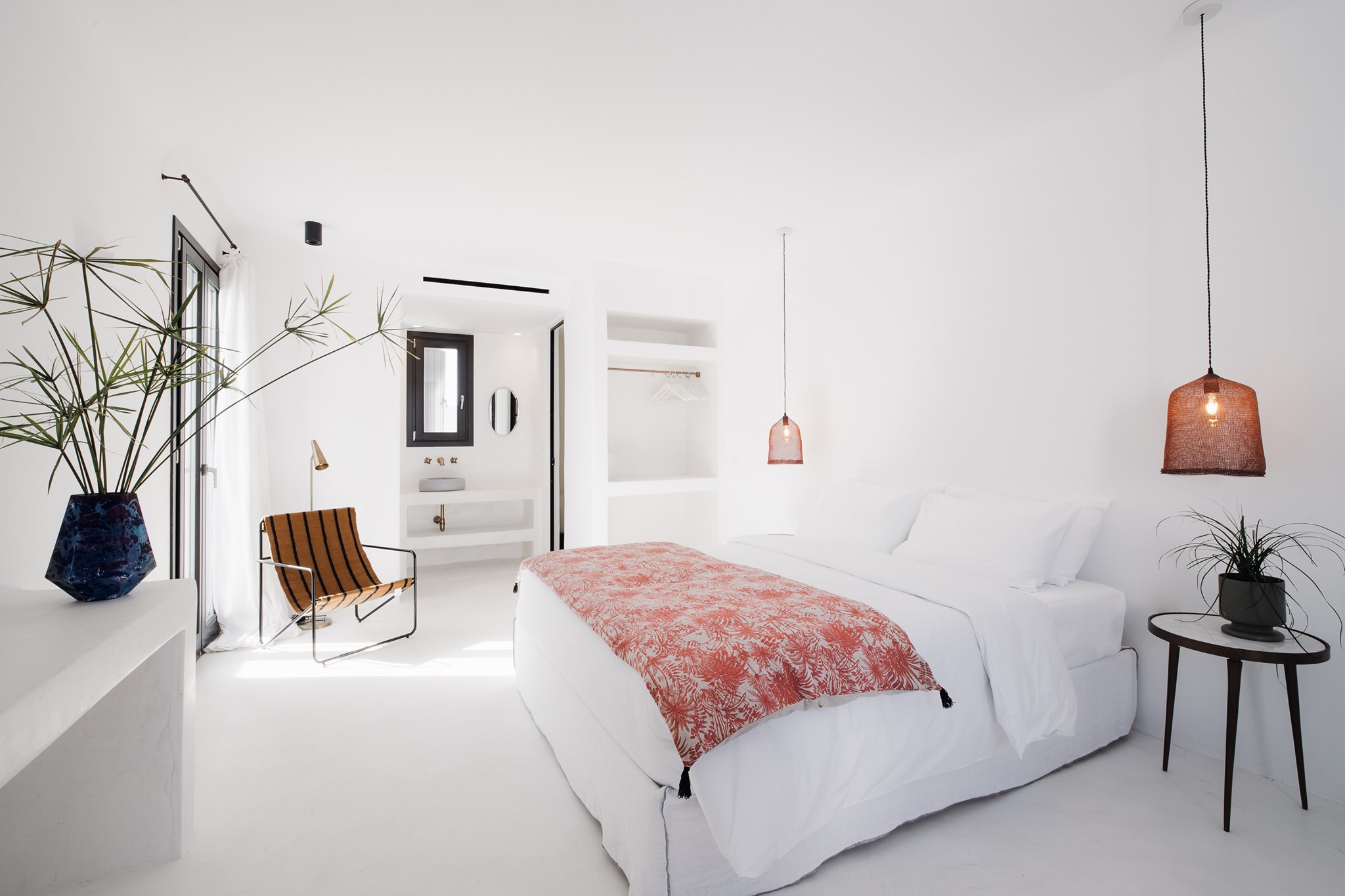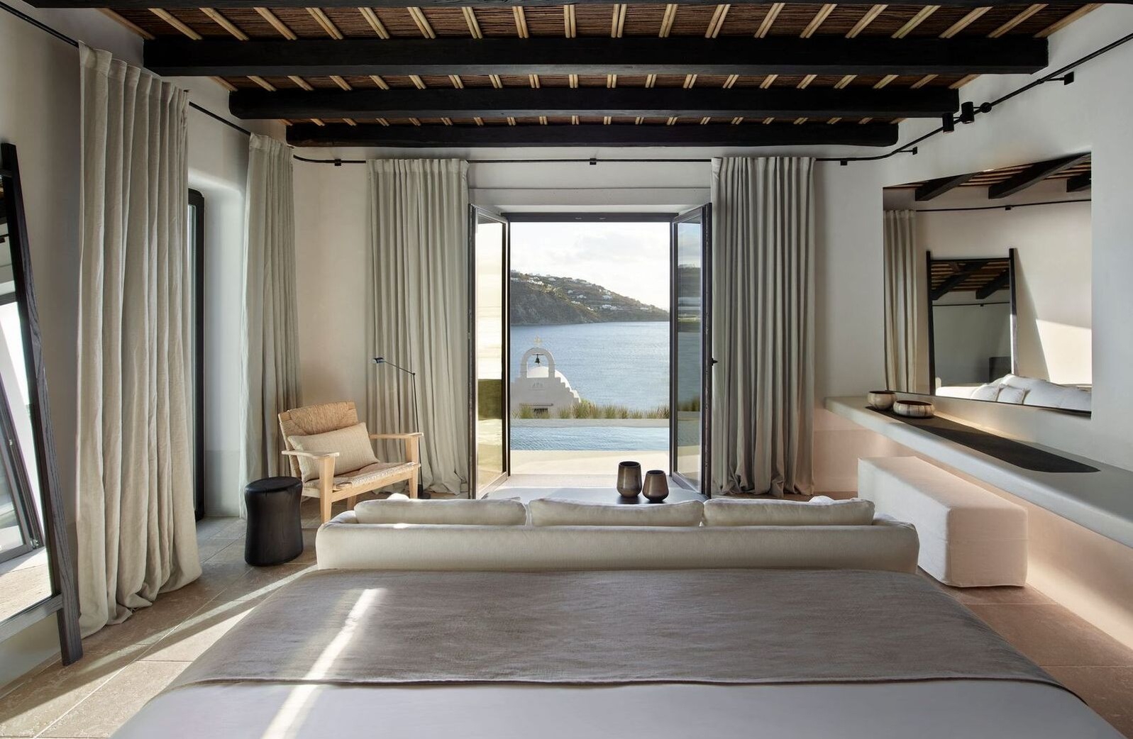 Rocabella seamlessly blends luxury with an eco-conscious outlook inspired by the natural light and scenic seductiveness of the island. Designed by Aphroditi Bonatsou of Stone and Walls, the hotel embraces the natural contours of Mykonos, incorporating local materials such as wood, stone, and sisal in homage to classic Cycladic architecture. The 24 rooms and suites offer tranquility, some leading to an expansive infinity pool with stunning views of the sea and eco-friendly, solar-heated water.