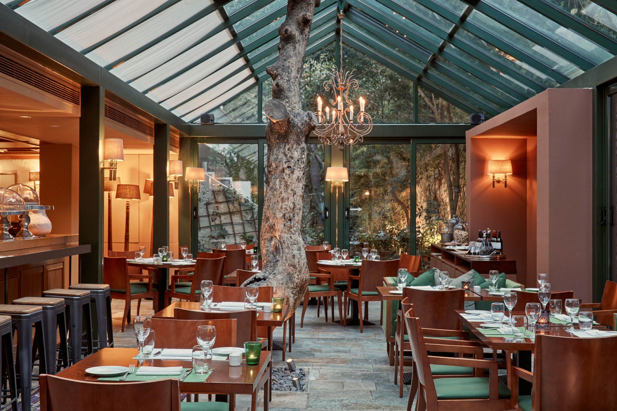 If the weather is not suitable for settling outside, take your book or laptop and enjoy a hot coffee at the lovely atrium of the ground floor’s elevated space, surrounded by olive trees. The two tree large trunks at the centre of this space create a countryside impression. Guests may also enjoy lunch or dinner at the atrium, especially during the winter months when the hotel’s special Point-a restaurant is not open. If in the mood for a cocktail, the bar at the hotel’s ground level is open throughout the day.