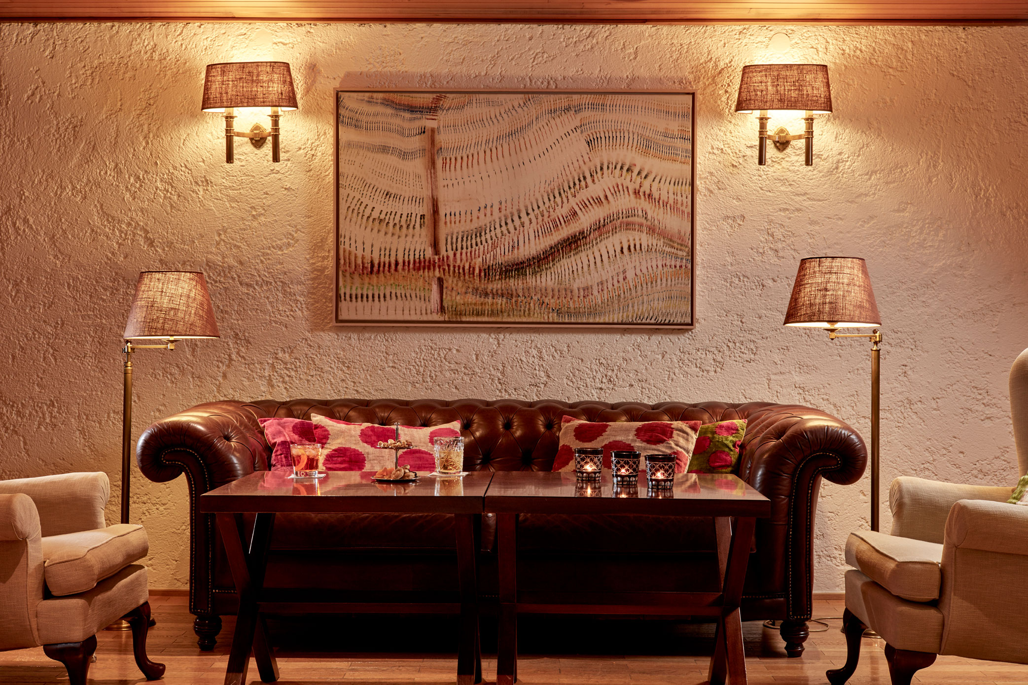 The ground-level space, steering well clear of typical reception areas, features warm colour shades, wood and marble elements, spacious and relaxing spaces, tasteful decor that superbly combines classic leather chesterfield sofas with abstract design and works of modern art, a fireplace with comfortable bergère armchairs and bookshelves to the side, as well as soft couch at a corner, all of which is offered to create a hotel experience of utmost relaxation, resembling the comfort of your favourite corner at home whilst reading a book or enjoying coffee.