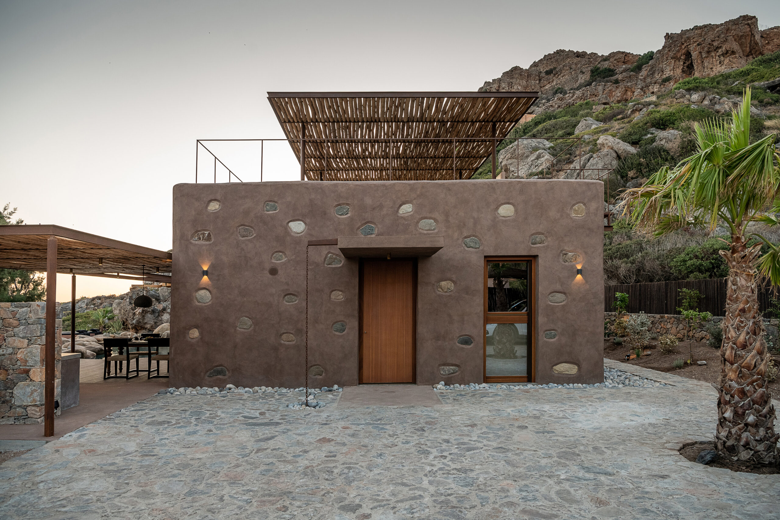 Surrounded by rocks of the area, the uniquely-shaped pool looks like a continuation of the sea –the residence’s permanent “companion”. All the materials used come from the surrounding natural environment: chestnut wood, stones in earth tones on the exterior walls and grey shades inside, metal painted in rust colour, stone slabs on the floor, wooden frames.