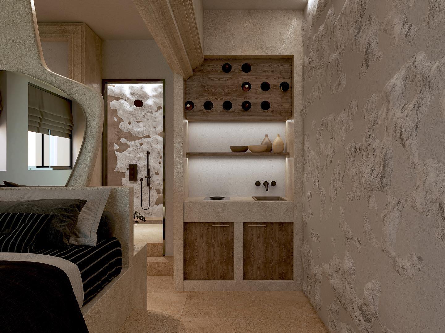 Built on a rugged slope above Naxos’ salt lake, this low-slung compound of villas and suites feels more like a nature observatory than a hotel. The African safari-inspired interiors—horned chairs, khaki tones, concrete floors—open onto fragrant gardens and unheated pools. Split-level villas come with kitchens, indoor fireplaces and deep, sculptural bathtubs. Upstairs bedrooms are lighter, with views reaching toward the sea. A wine cellar hosts tastings; limited edition cigars are kept in a dedicated fumoir. Produce comes from the hotel’s own Mandala Garden, planted according to the lunar cycle. Dinner is served outdoors on the lawn—weather and wind permitting.