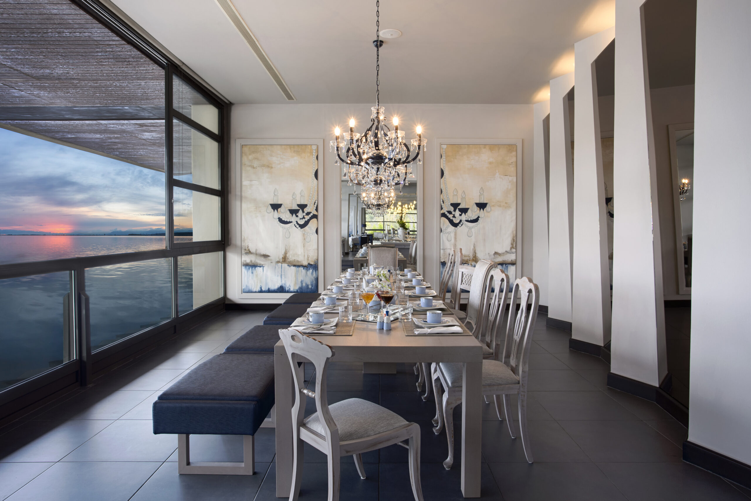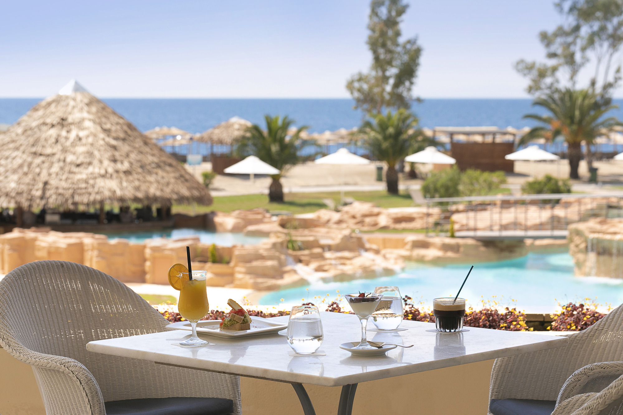 Starting early in the morning, breakfast is served in the main restaurant “Athos” with a view of the sea, and in Crystals Suites Restaurant with the large windows that overlook the yachts in the marina. The buffet includes an immense variety of delicious sweet and savoury options, both hot and cold, a wide selection of coffees and fresh juices.