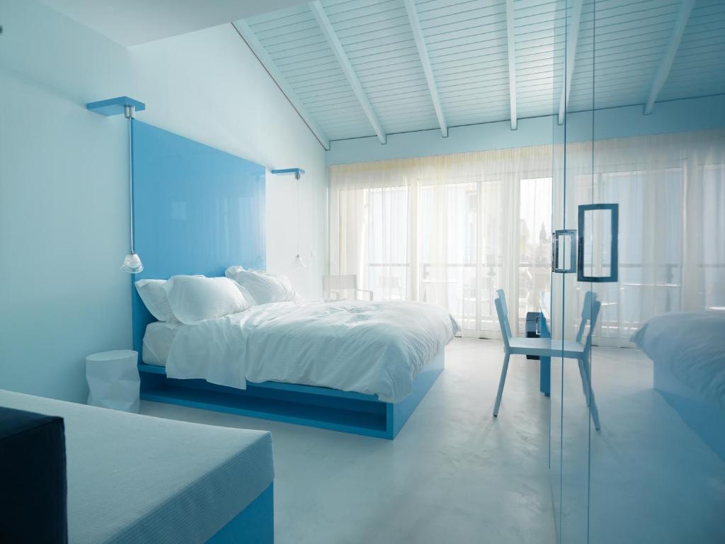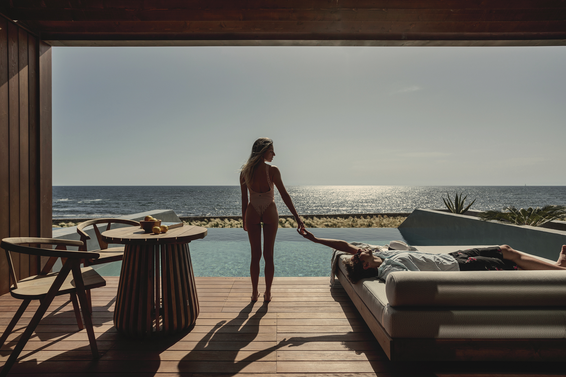 Luxury boutique hotel, member of the Small Luxury Hotels of the World group, with elegant minimal décor, in total harmony with the natural scenery. The reception that is open to the exterior creates a continuum with the surrounding space and has an unobstructed view of the sea. The hotel offers sun beds and umbrellas on the beach and there’s also a pool next to the reception.