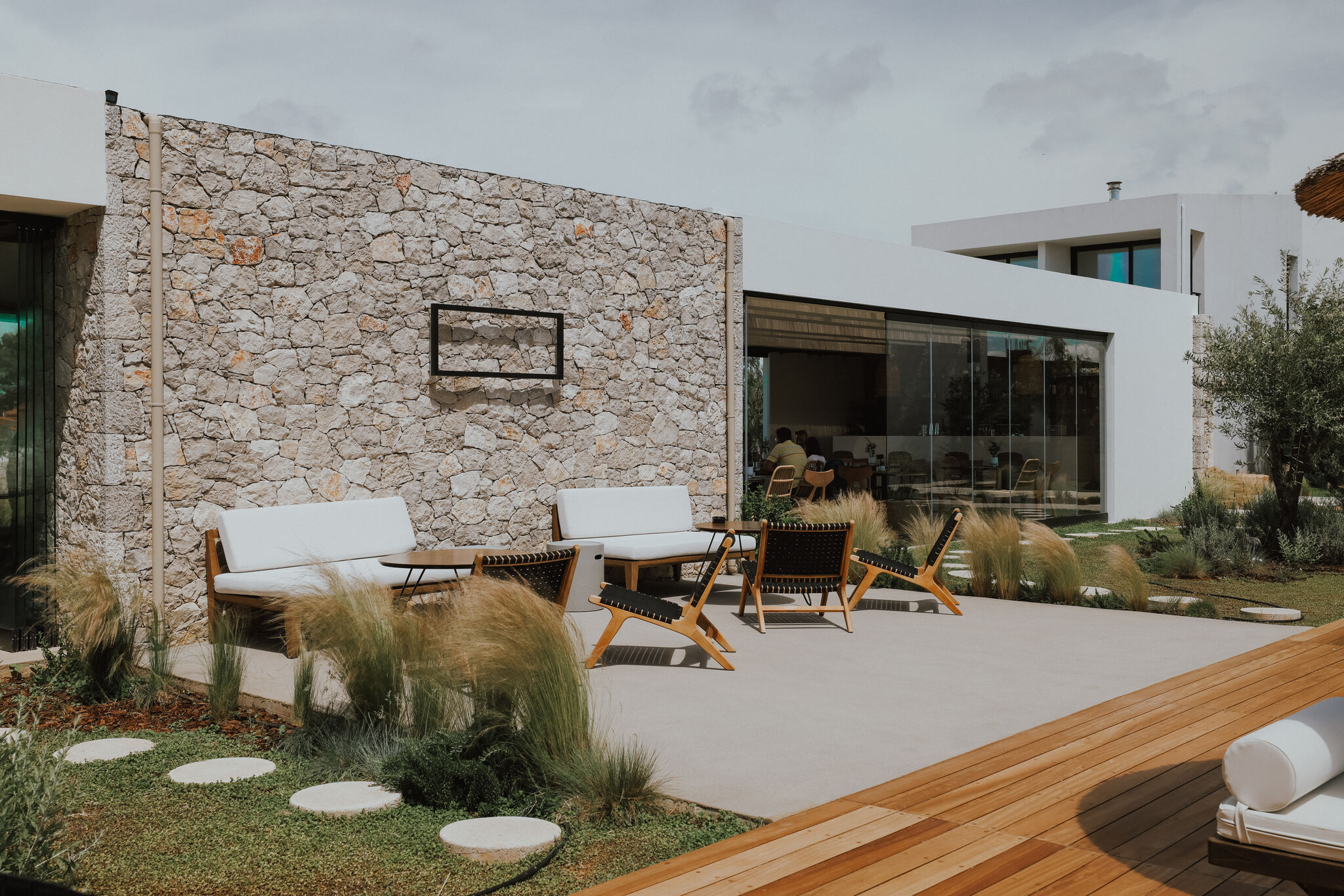 In the Mytikas village, in total harmony with the natural scenery, with roomy spaces that give a feeling of freedom and cleanliness. Geometrical buildings, rooms with large windows, and lots of natural light. Stone and wood are the main materials that are beautifully complemented by the presence of water and of many plants.