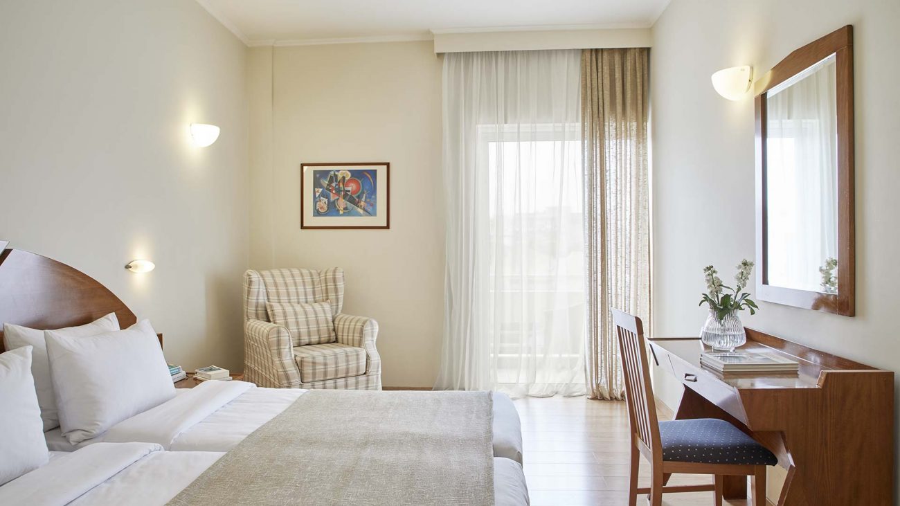 A neat city hotel in the heart of town, next to the historic centre, just ten minutes away on foot from the Kiani Akti beach. Off white shades and lots of natural light, classic light wooden furniture, antiques that add warmth to the space, and the unexpected presence of an impressive, huge vintage motorcycle in the reception.