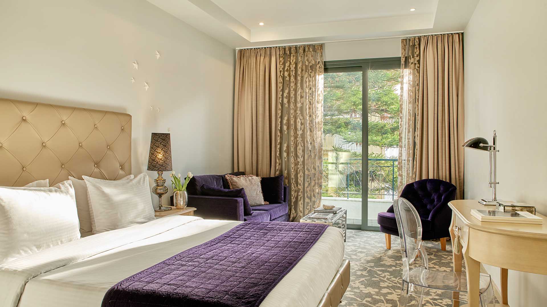 Mix & Mach décor in the rooms, with purple velvet fabric, lacquered desks and transparent chairs. Breakfast served in the roof garden with a lovely view of the town and the port.