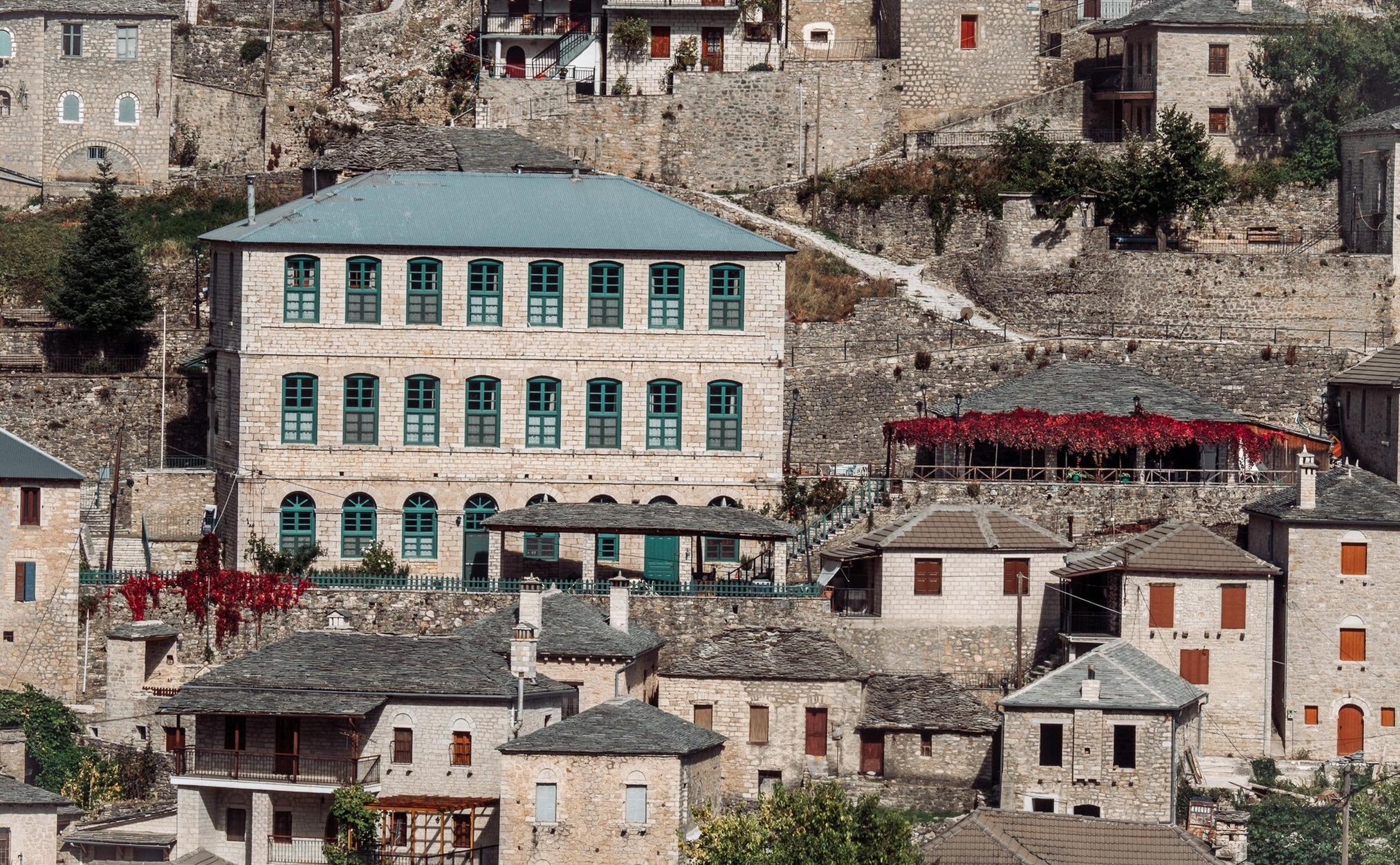 The iconic three-story stone building, which once served as the village school in Syrrako and is classified as a modern monument, has been transformed into a charming boutique hotel with 9 rooms, a reception area, and a breakfast hall. Built a century ago, it stands out from afar and was a meeting point for students of the village for many years. Today, it has become a warm and welcoming space with traditional woven rugs, dark wooden furniture, aesthetically pleasing colors, and comfortable beds and mattresses. Some rooms feature fireplaces, while breakfast is served in one of the two lounges, with an emphasis on quality and local ingredients.
