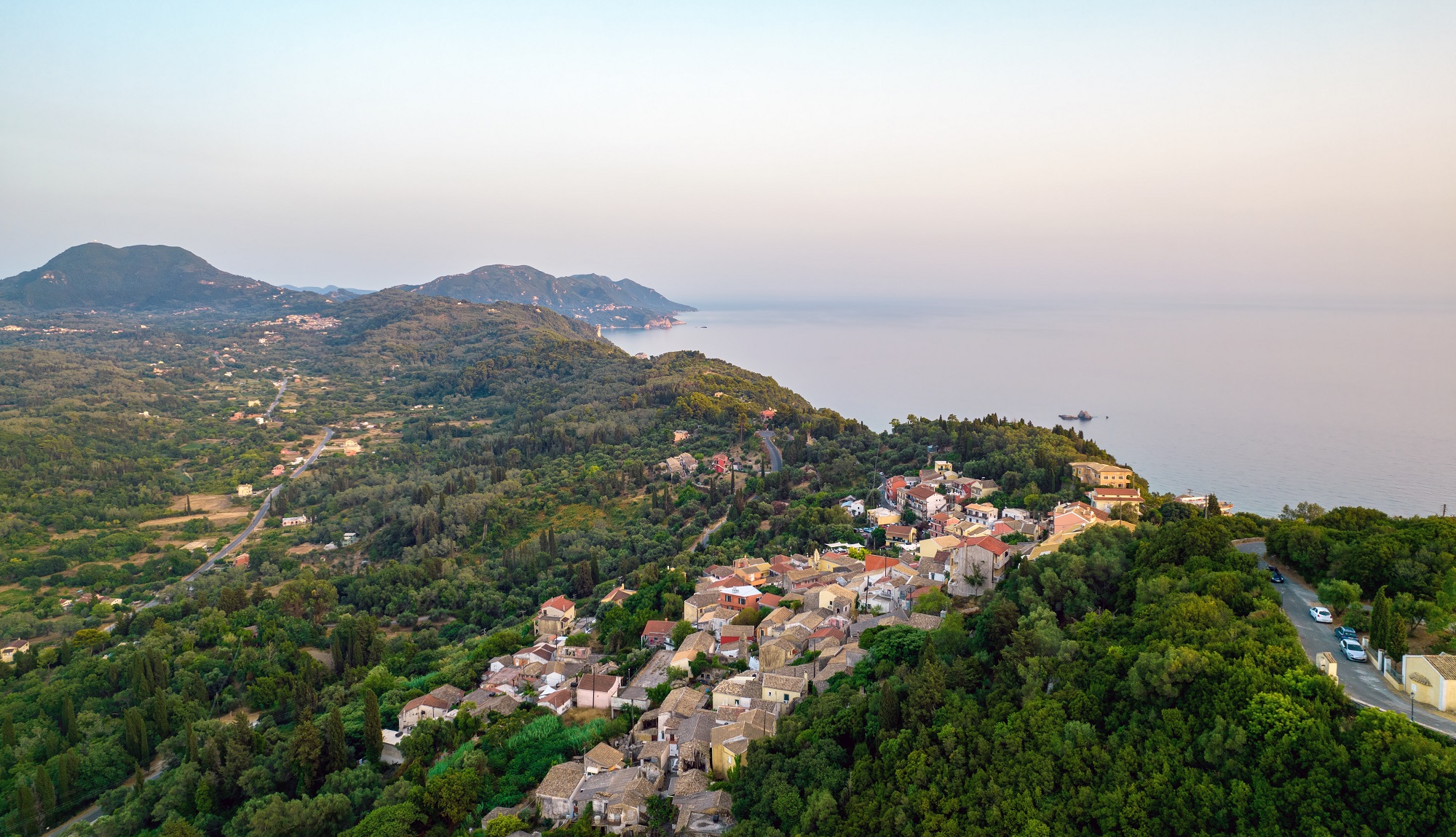 Thanks to the car we rented, we wanted to devote more time to exploring the rest of the island on four wheels. We left the city behind and followed the provincial road leading to the village of Pelekas. We found ourselves in the heart of spring when Corfu’s nature is truly at its most glorious. Almost throughout the entire route, we encountered blooming gardens and fields carpeted in wildflowers. Panoramic view of Pelekas and its coastal area, from the Kaiser’s Observatory.